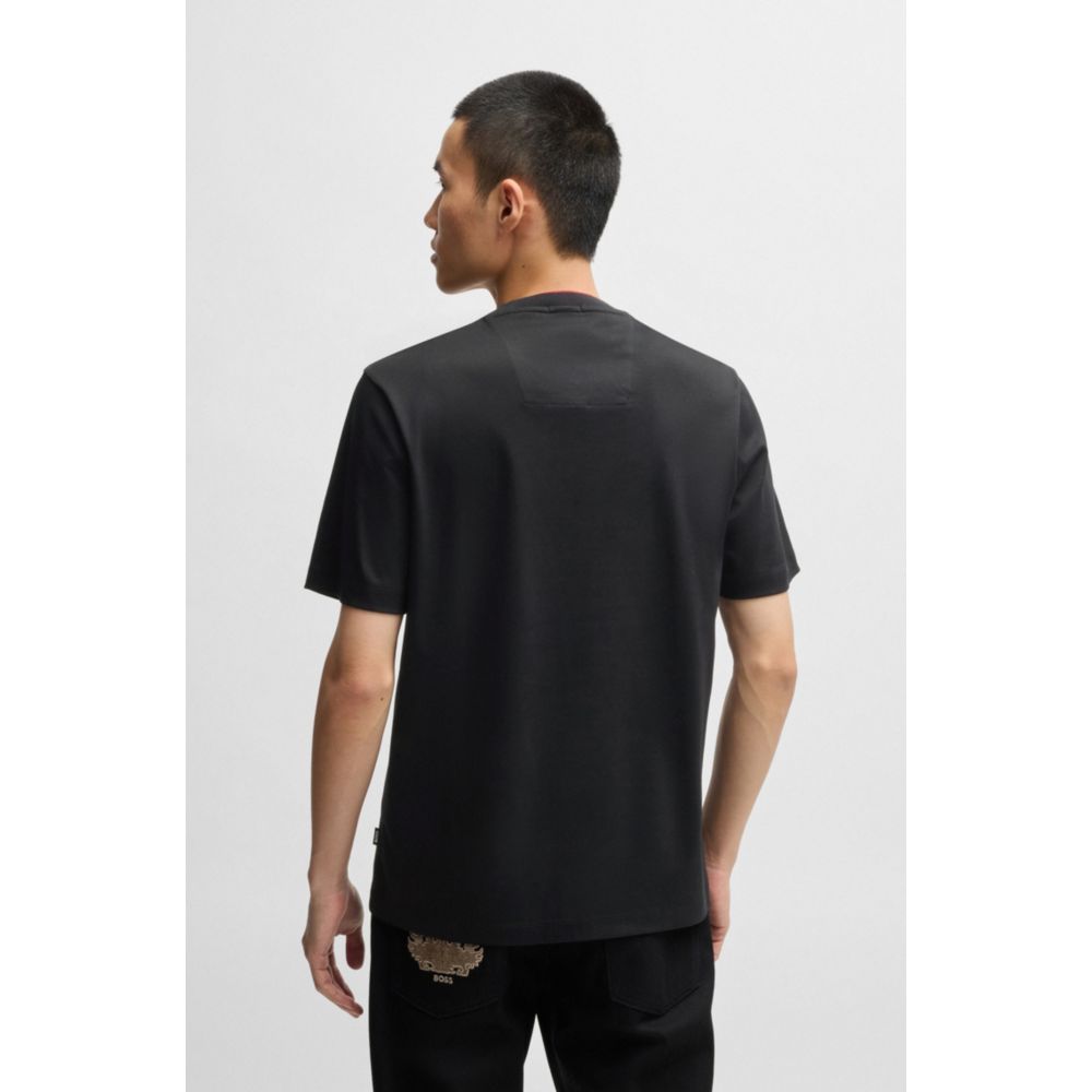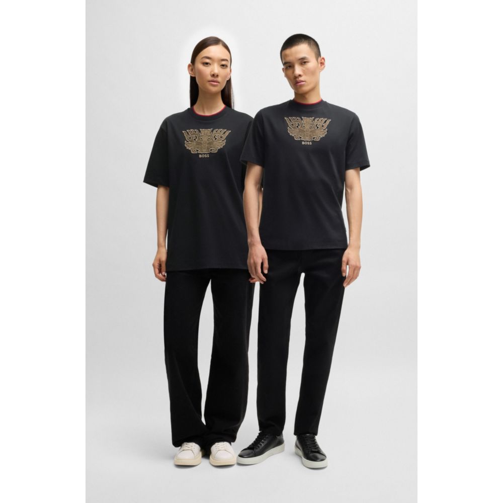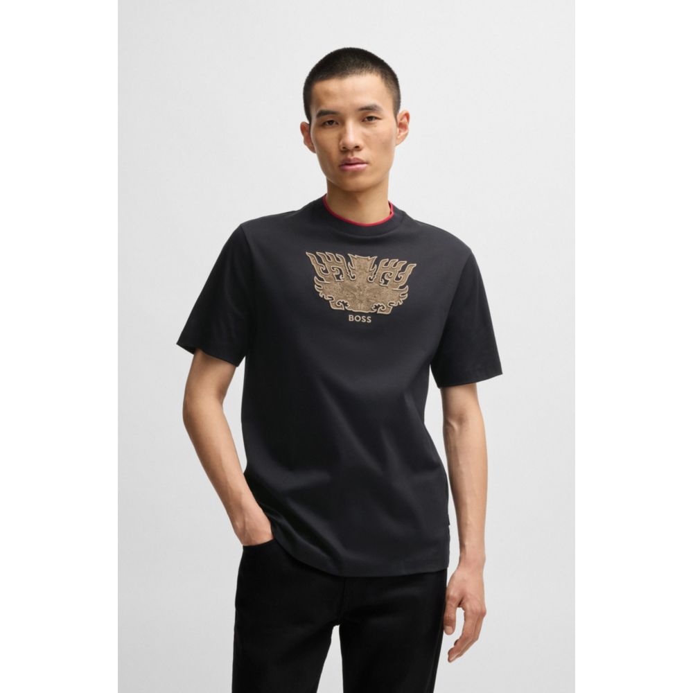 Добавьте эффектности повседневным образам с этой универсальной футболкой, вышитой традиционным узором даоте, символизирующим силу и тайну. Удобный классический крой из хлопка интерлок. Отпразднуйте год Змеи с капсульной коллекцией BOSS x Creation of the Gods, вдохновленной типографикой эпического фильма и декоративными металлическими деталями, а также традиционными узорами бронзовых изделий династии Шан.