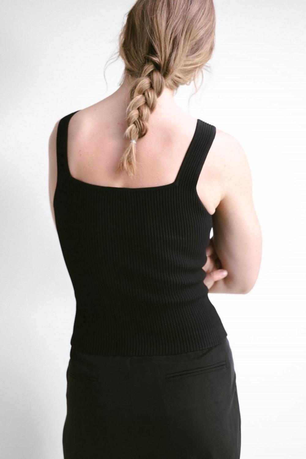 Квадратный вырез. Трикотаж в рубчик по всему изделию. 86% нейлон, 14% спандекс. Ткань тянется.