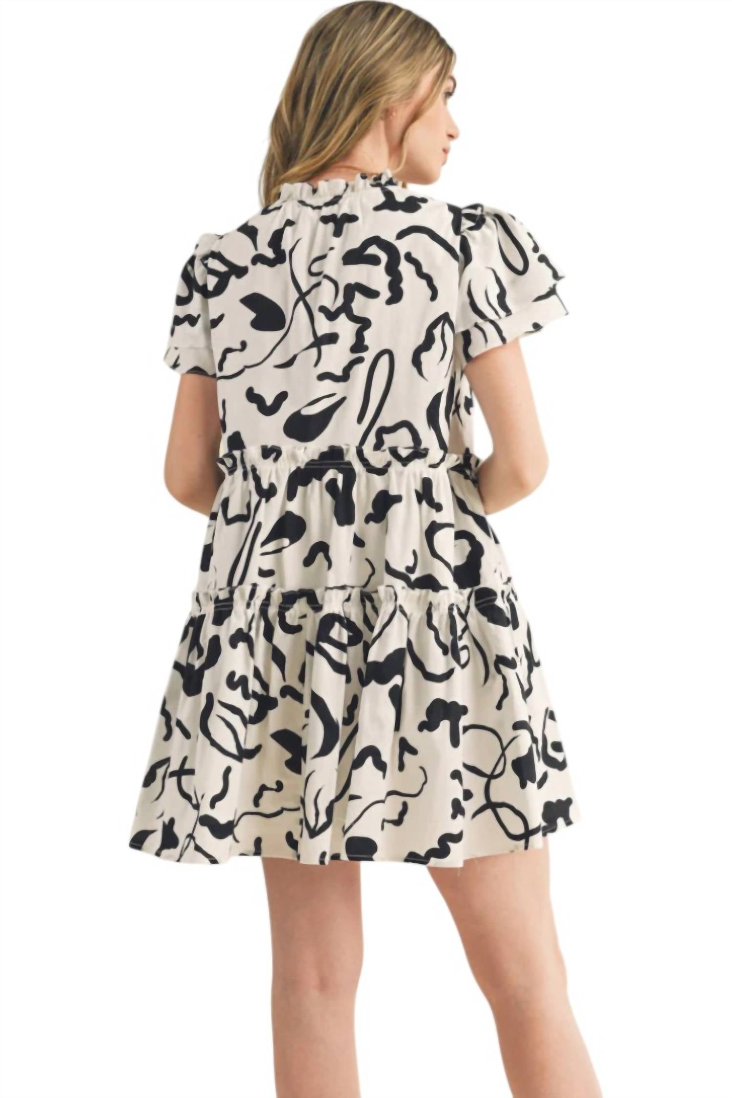 Легкое тканое платье. Короткие рукава-крылышки с оборками и завязывающийся V-образный вырез. Дополнено эксклюзивным черно-белым абстрактным узором. Высокая талия с оборками. Силуэт бэби-долл А-силуэта, изящно спускающийся к мини-подолу. Непринужденная элегантность обеспечивает беззаботную застежку-липучку.