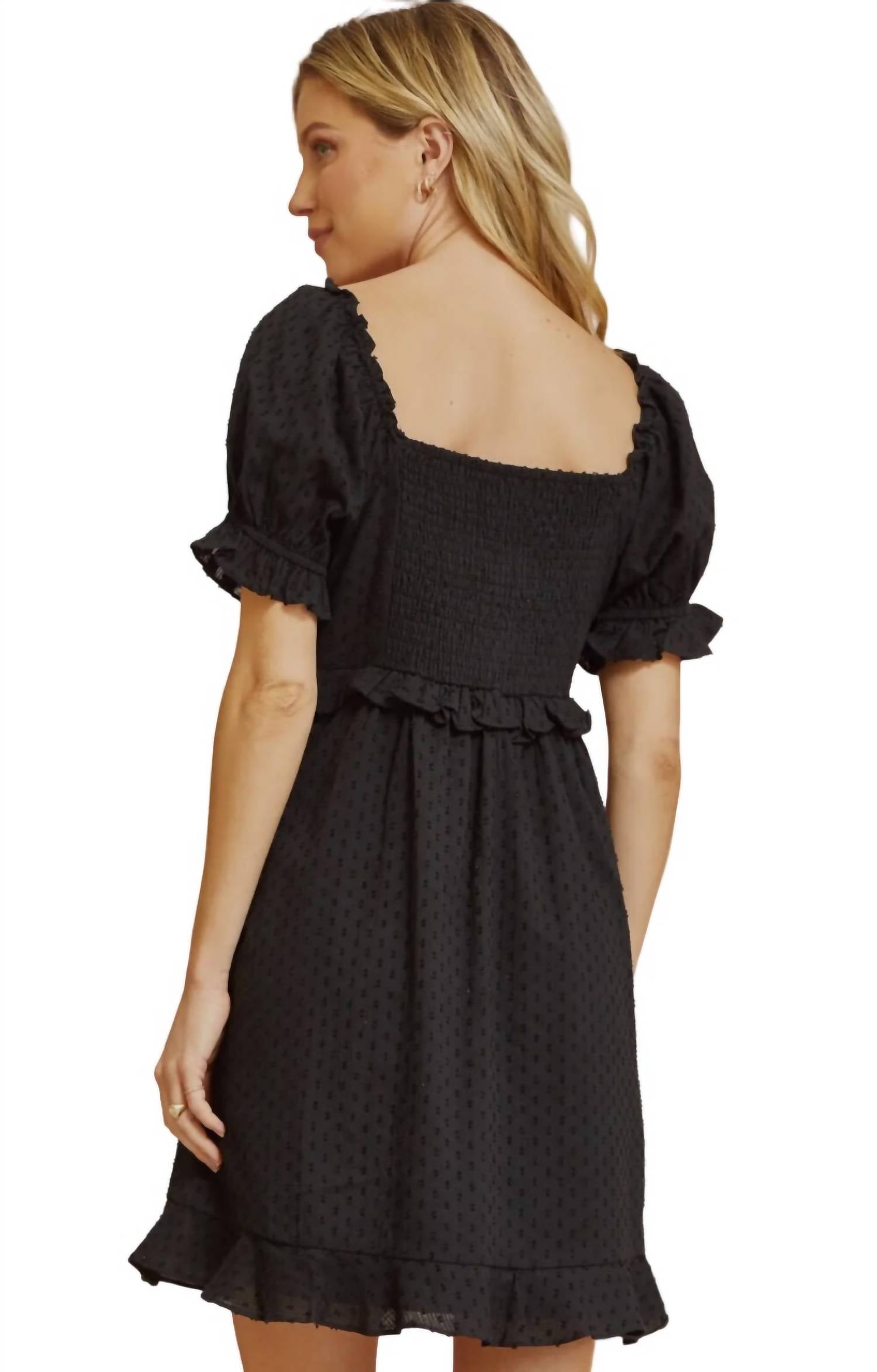 Мини-платье с текстурой и рукавами-фонариками. Присборенная спинка, вырез в форме сердца и лиф с рюшами. 100% поли. На подкладке.