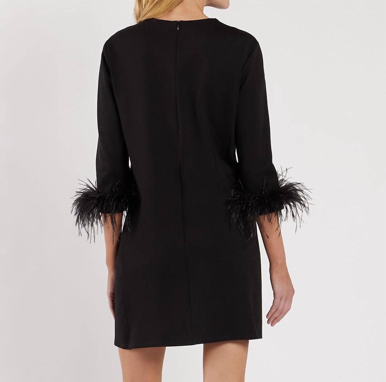 Рукава 3/4 с перьями на манжетах. Потайная молния по центру спины. 35 дюймов от верхней точки плеча. Сделано в США. Рост модели 5 футов 9 дюймов, размер Small. Вискоза/нейлон/спандекс. Рекомендуется химчистка. Можно стирать в стиральной машине в холодной воде, сушить на веревке.