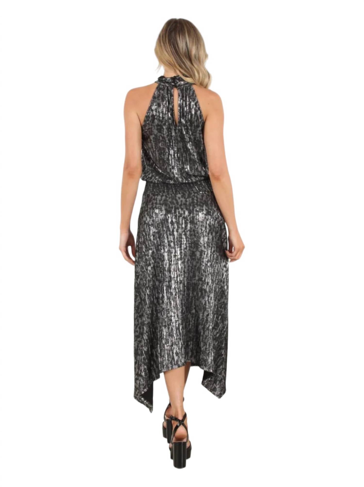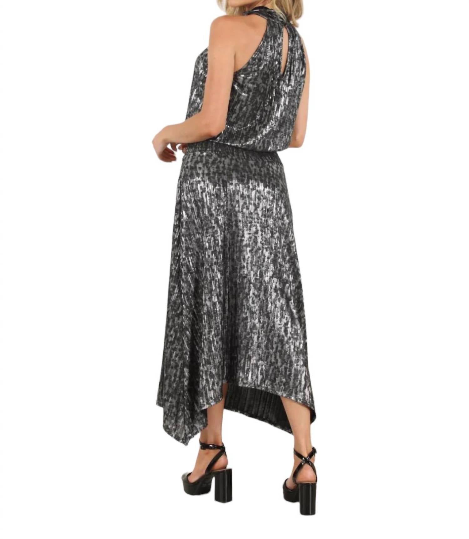 Без рукавов, с завязками на шее и высоким вырезом. Затянутая талия. Ткань имеет металлический блеск, кажется, в черно-серебристой цветовой палитре. Юбочная часть платья асимметрична, она короче спереди и постепенно удлиняется к спине, что создает эффект высокой-низкой линии подола. 96% полиэстер 4% спандекс.