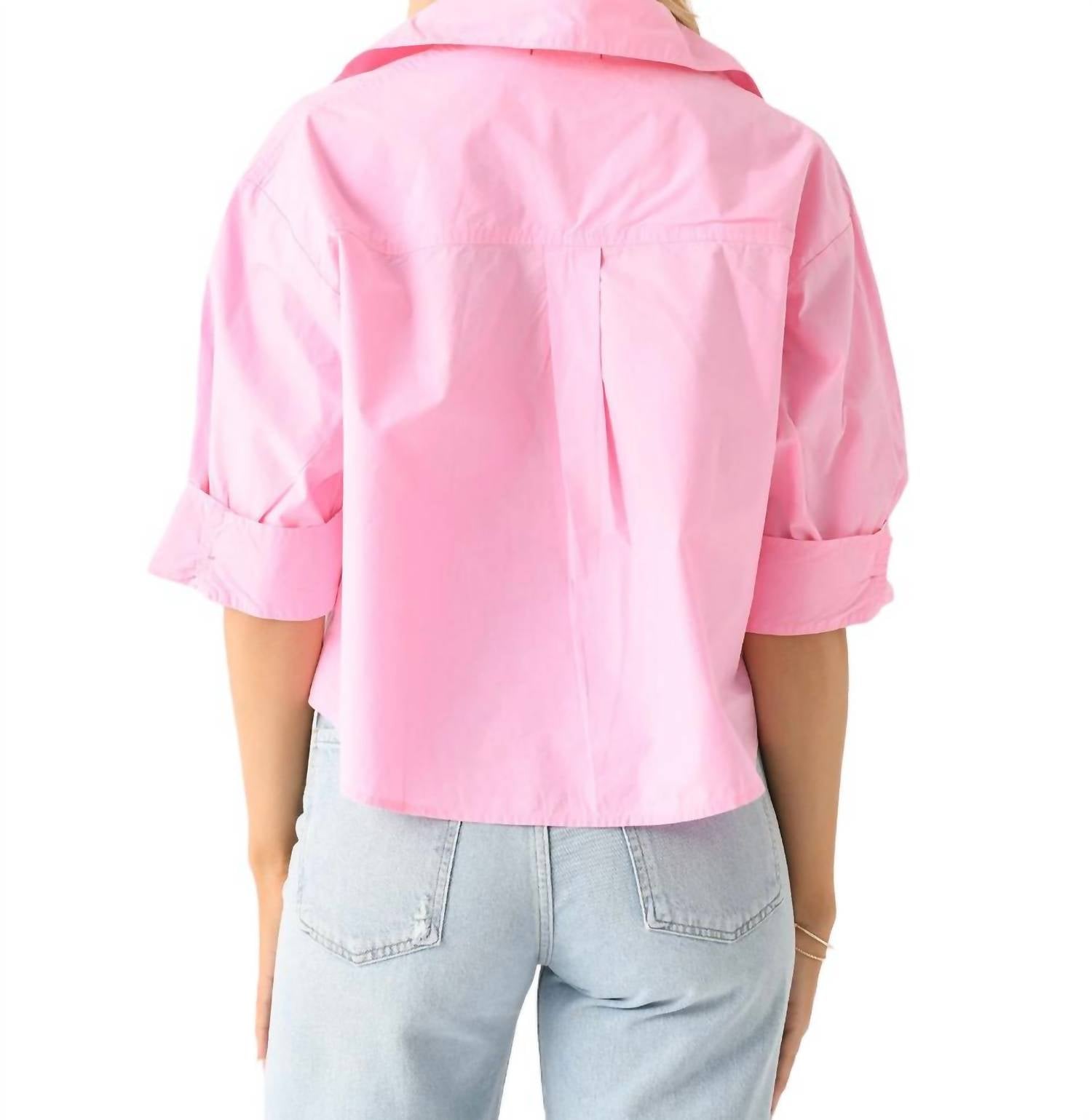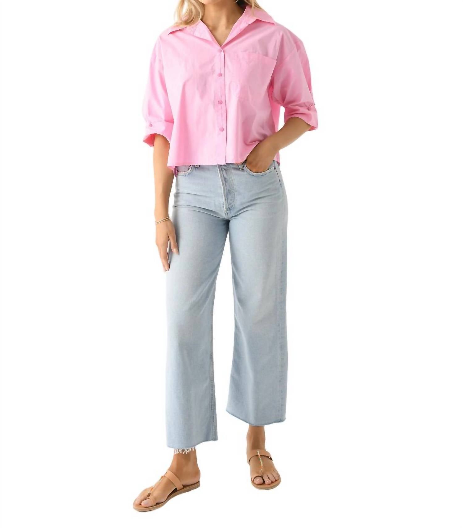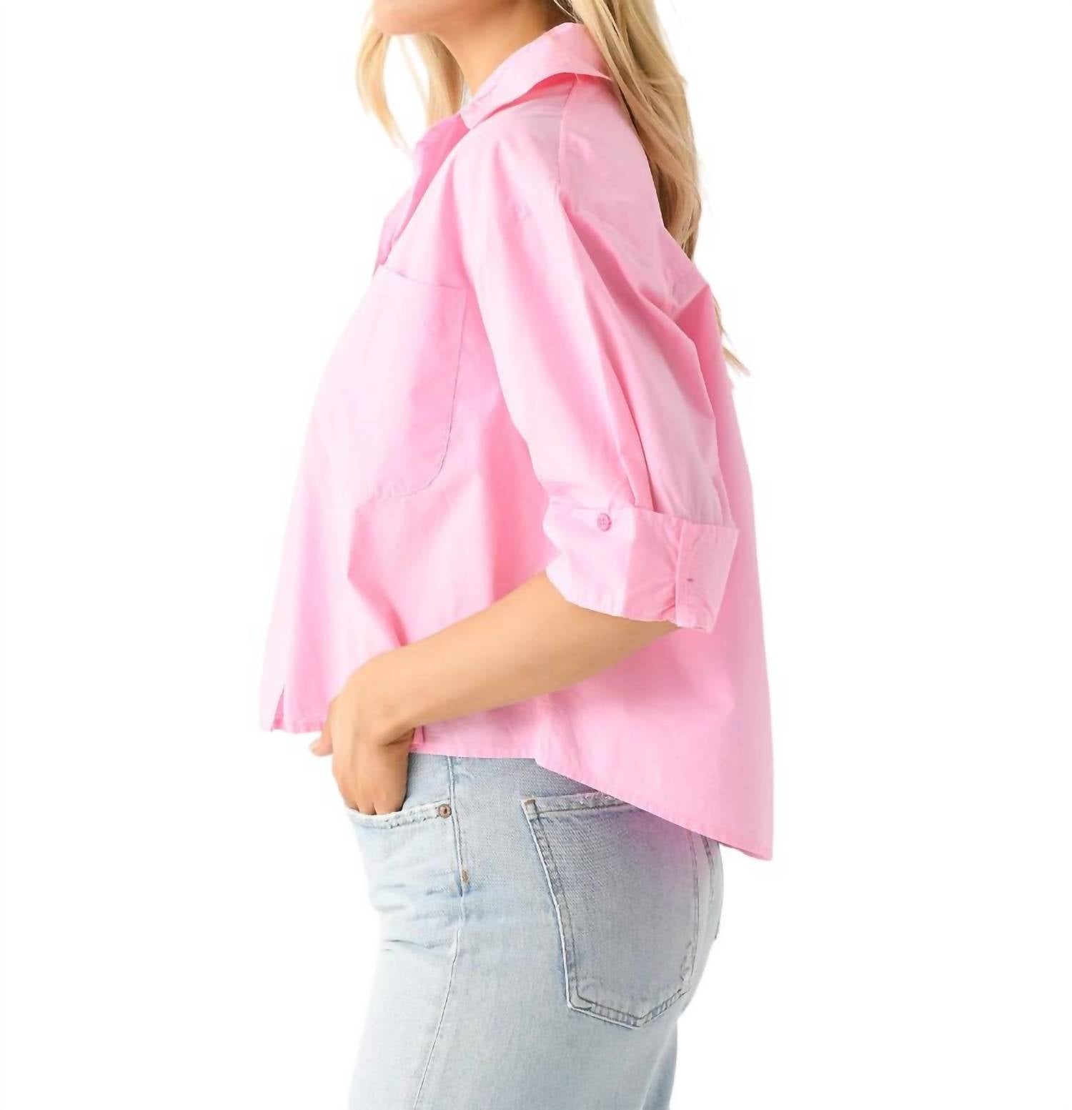 Слегка укороченная блузка на пуговицах из легкого хлопка. Имеет отложной воротник, спущенное плечо, левый нагрудный карман, манжеты на пуговицах, планку на пуговицах и свободный крой. 100% хлопок.