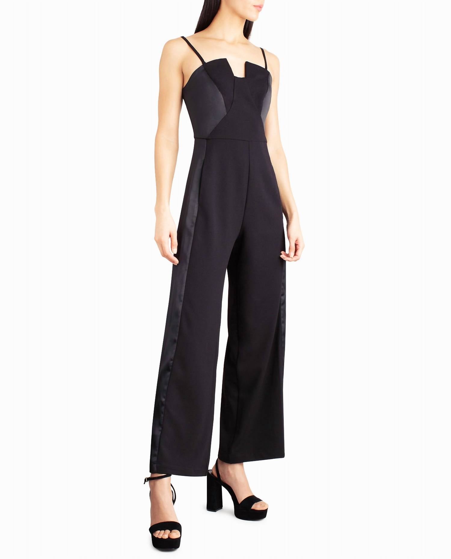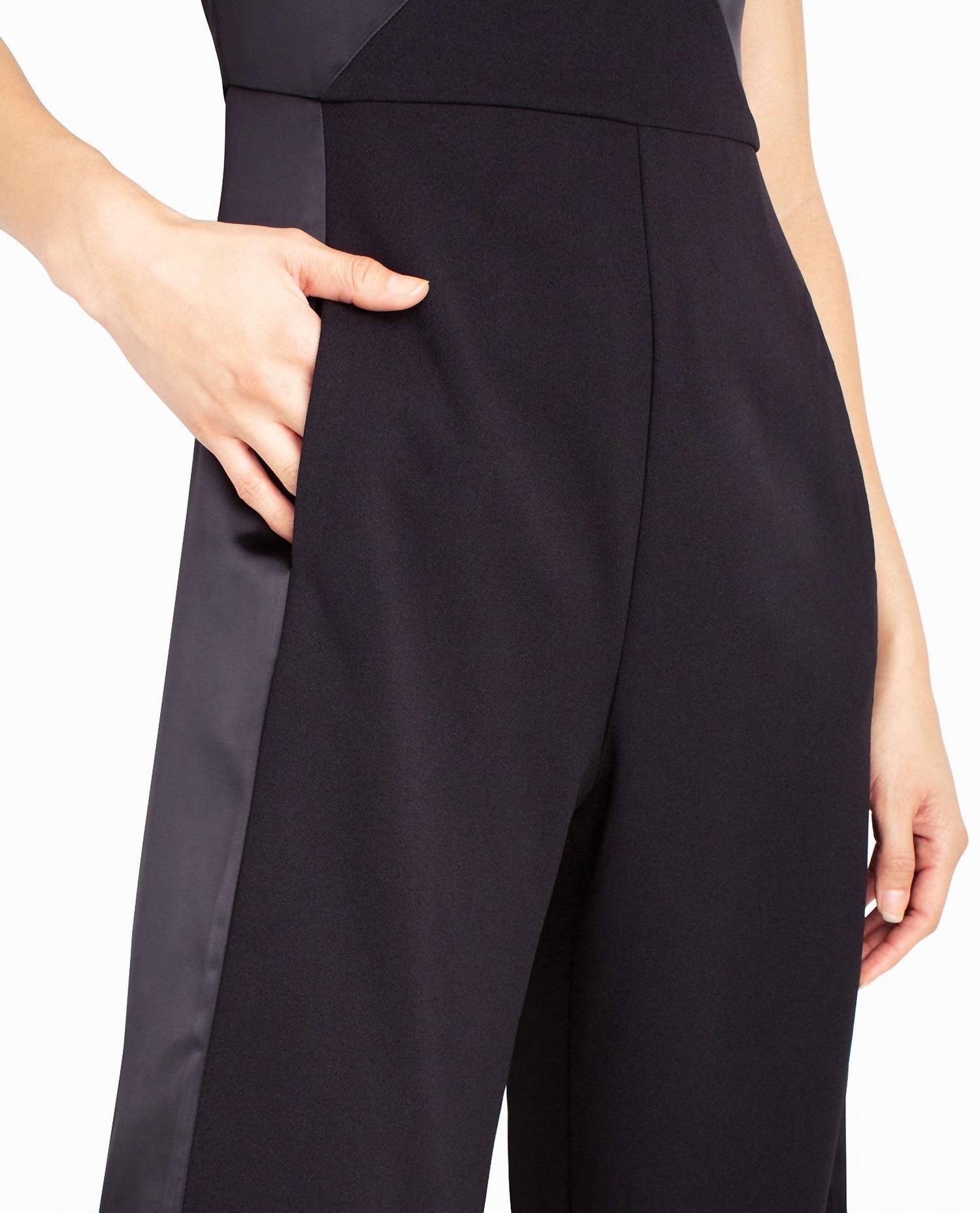 Этот комбинезон-смокинг имеет дополнительные лямки, высокую талию и широкий силуэт штанин. Изготовлен из 95% полиэстера, 5% спандекса, он предлагает свободную посадку, практичные карманы и сдержанную застежку-молнию.