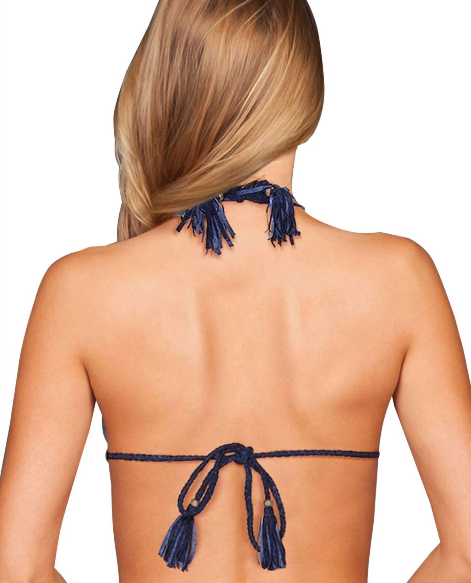 Этот трансформируемый бикини-топ предлагает два варианта стиля: высокий вырез с замочной скважиной или богемный вид с бретельками за шеей. Изготовлен из 72% нейлона и 28% лайкры, имеет плетеные завязки из микрозамши, кисточки и бусины для дополнительного шика.