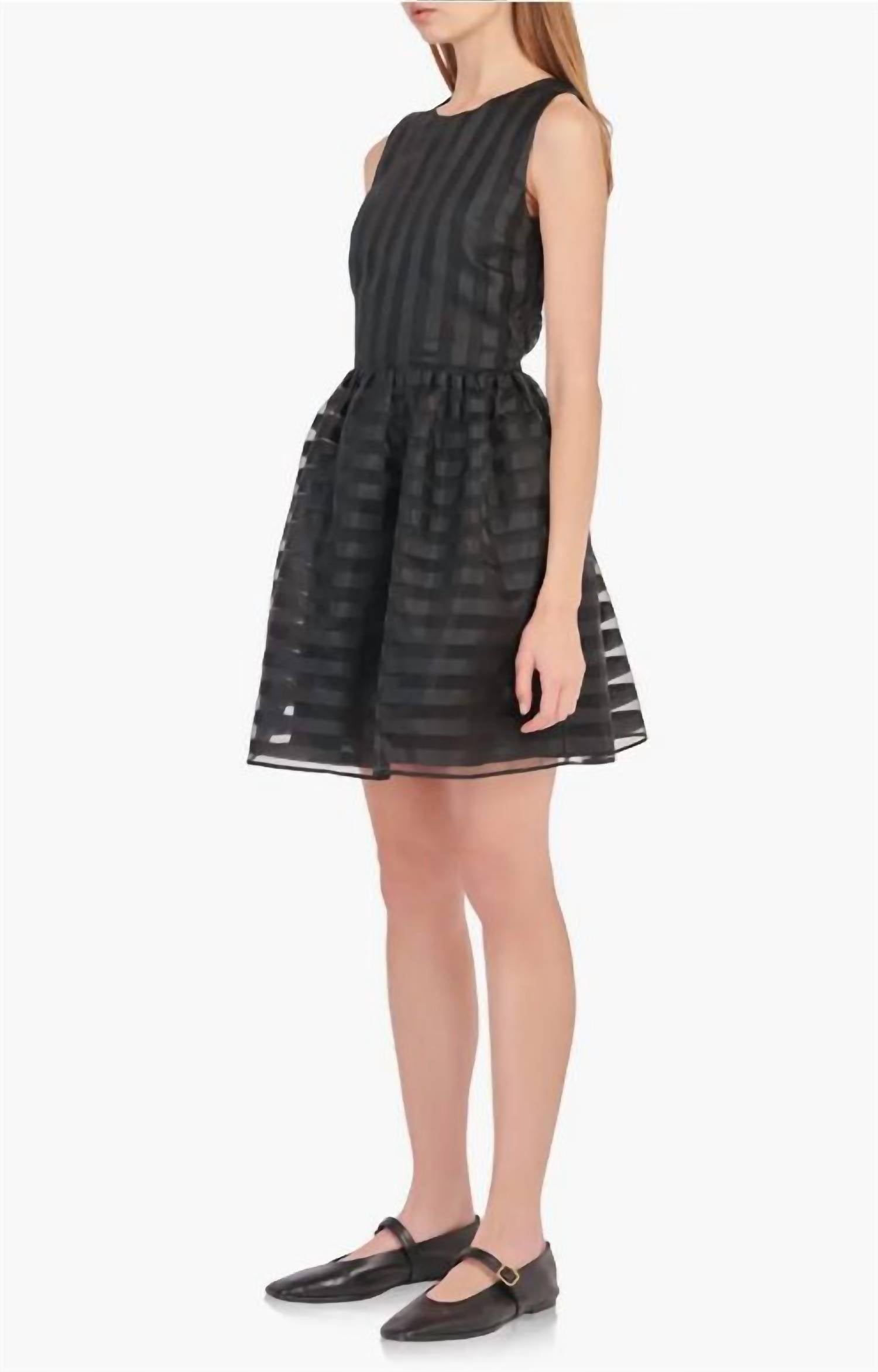 Идеальное мини-платье для теплых месяцев. Причудливые полоски украшают это длинное платье из органзы без рукавов с объемной юбкой. Вырез-драгоценность. Без рукавов. На подкладке. Молния сбоку.