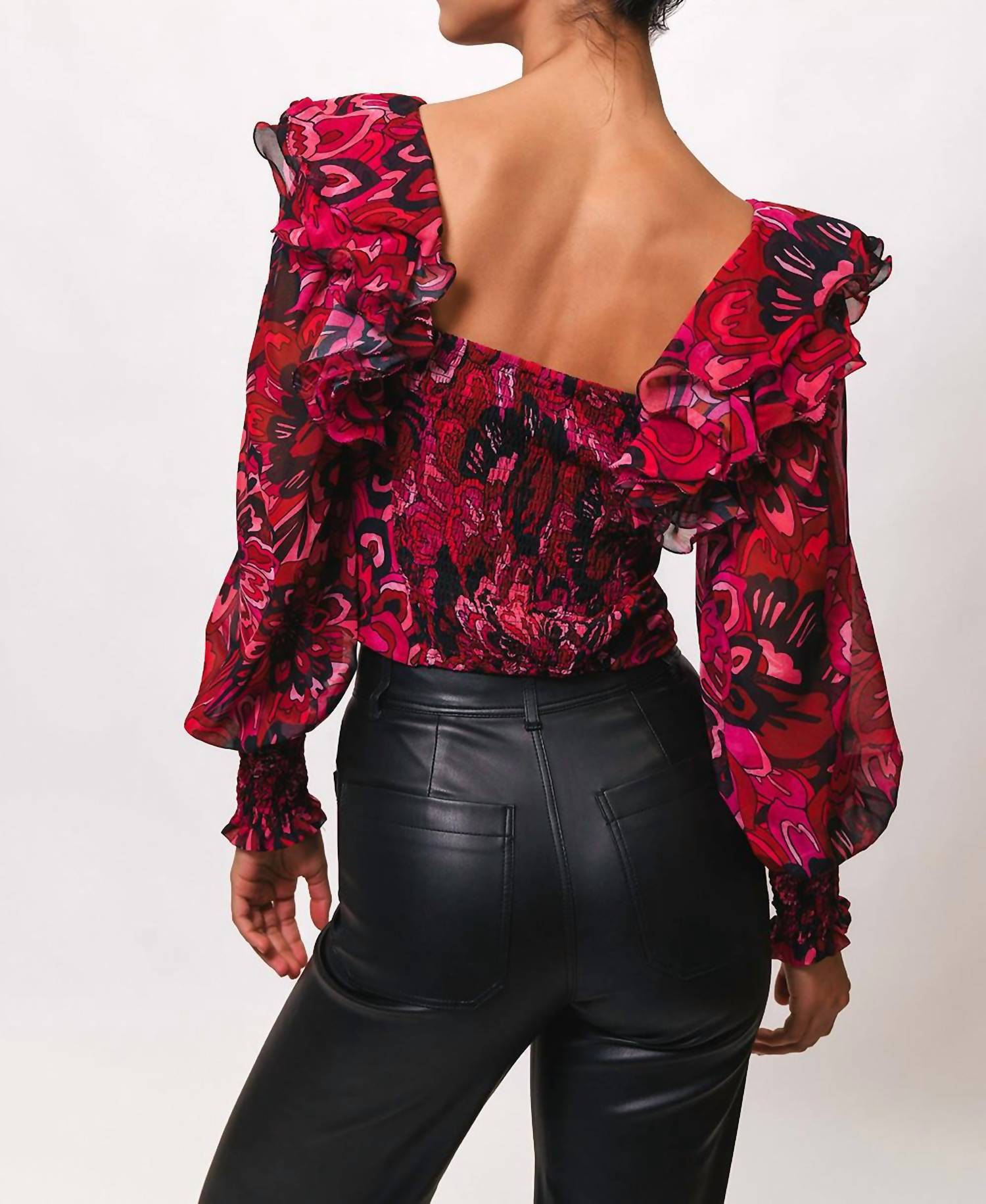 Эта блузка с длинным рукавом демонстрирует потрясающий дизайн плеча-оборки, выполненный из роскошного шифона с фактурным ретро-цветочным узором. Силуэт V-образного выреза обеспечивает приятную посадку и непринужденное ношение с удобной застежкой-липучкой. Идеально подходит для добавления нотки изысканности в любой ансамбль.