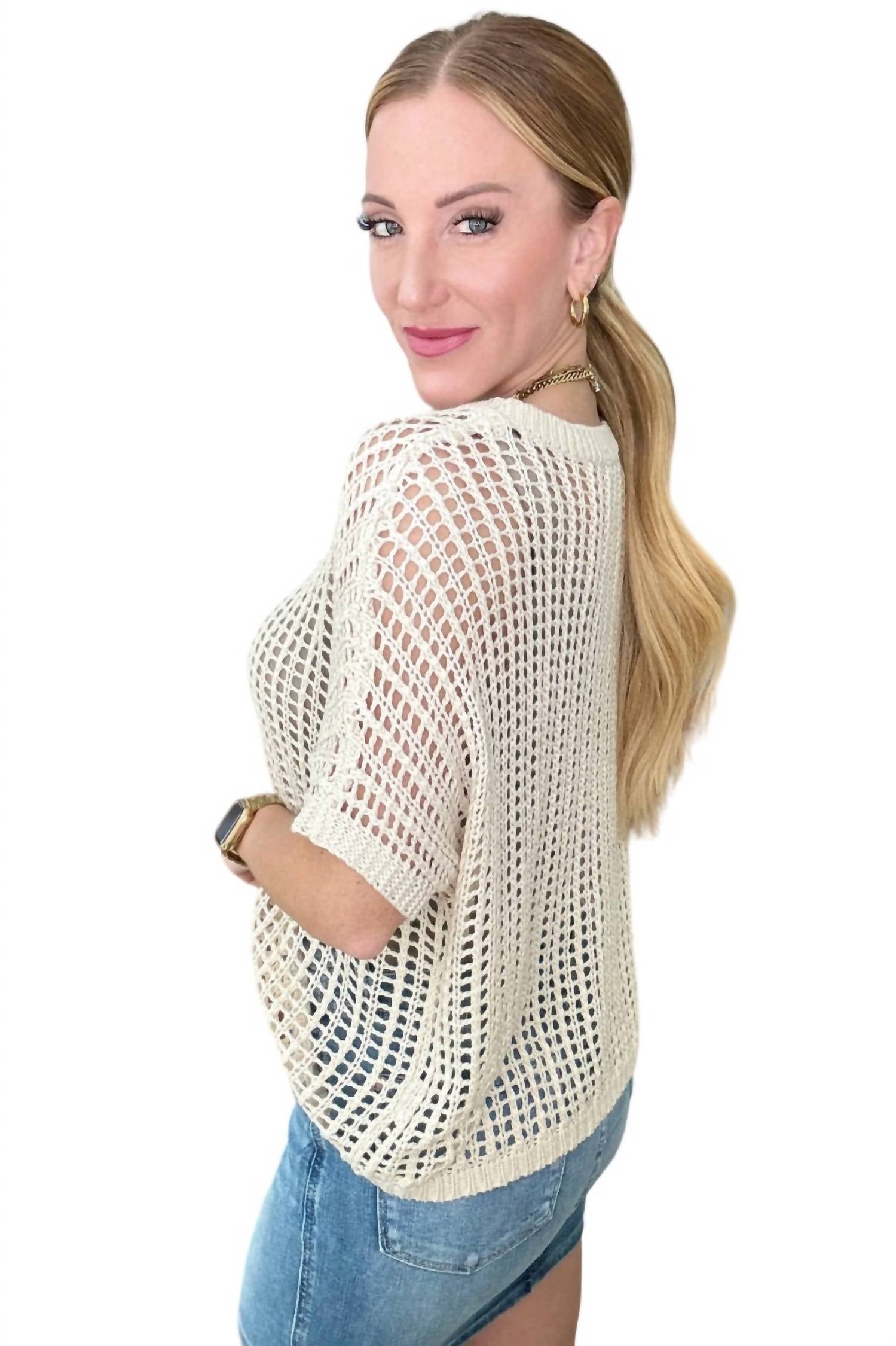Ажурный свитер с открытой вязкой. Круглый вырез горловины. Рукава до середины. Майка в комплект не входит. 100% акрил. Соответствует размеру.