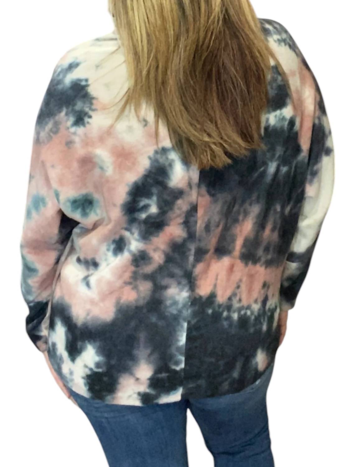 Вырез-хомут. Тай-дай. Длинные рукава. Модель в стиле пуловера. 63% полиэстер, 34% вискоза, 3% спандекс. Машинная стирка в холодной воде.