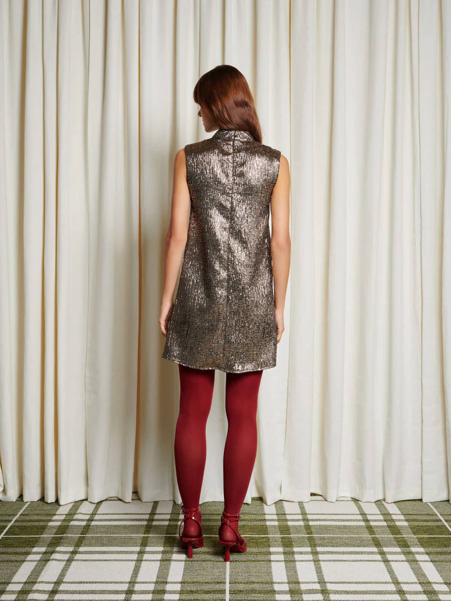 Эффектная модель без рукавов из 100% полиэстерового металлизированного жаккарда. А-силуэт демонстрирует вертикальные косые оборки с необработанной отделкой для смелого, фактурного вида. Разработан с гладким ложным вырезом. Завершается удобной застежкой-молнией сзади. Длина 32,6 дюйма. Полностью на подкладке мини-платье обещает ослепить бронзовым блеском.