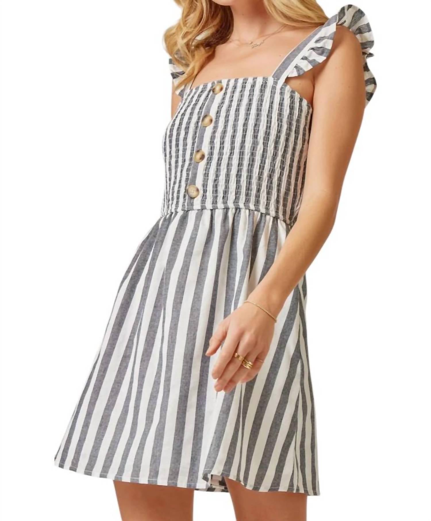 Это присборенное полосатое платье с рукавами-крылышками, расклешенной юбкой и подкладкой. Оно изготовлено из 80% хлопка и 20% полиэстера.