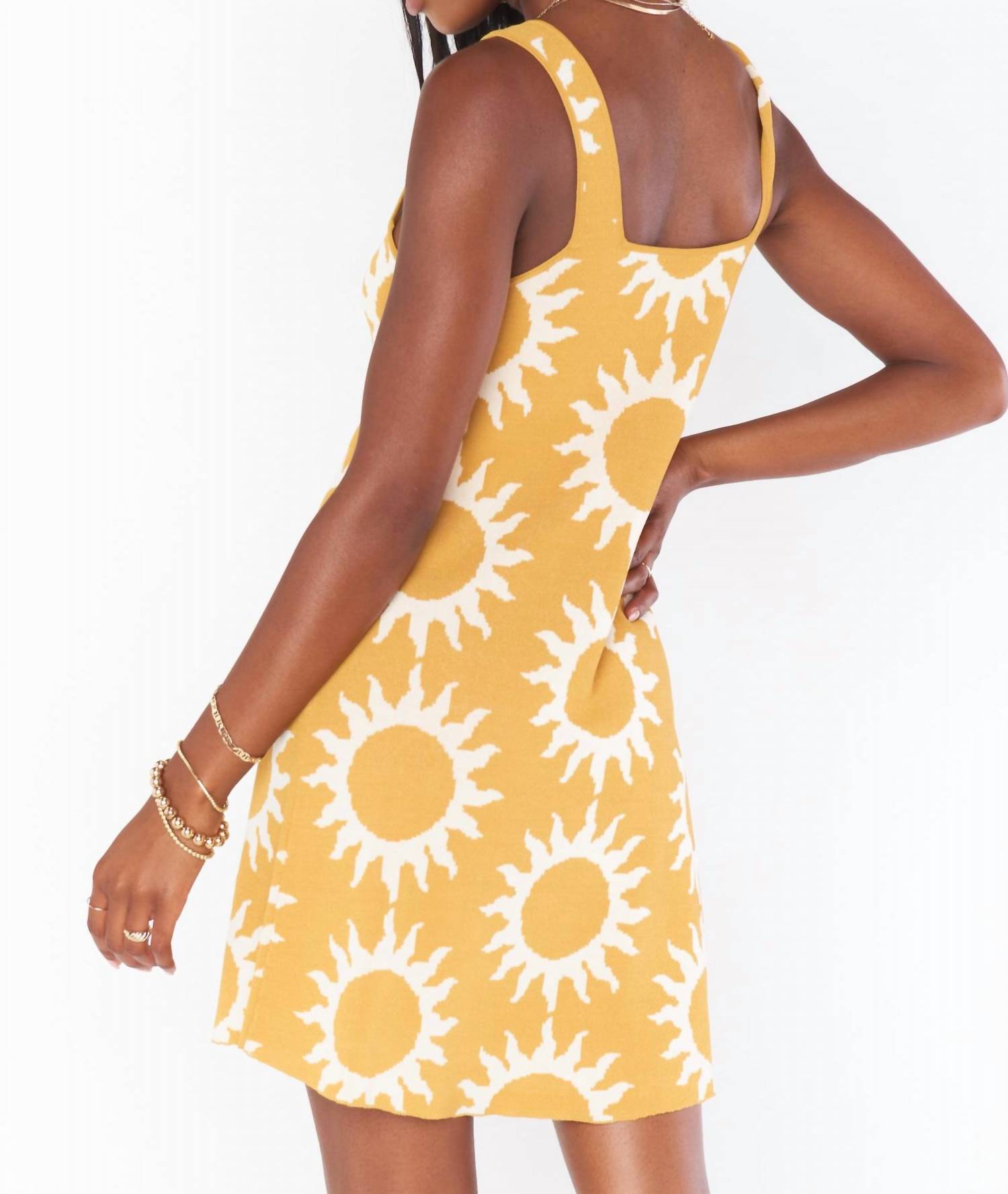 Это солнечное трикотажное платье имеет квадратный вырез и рукава-майку. 80% вискозы, 20% нейлона. 32 3/4 дюйма от плеча до подола. Импортное