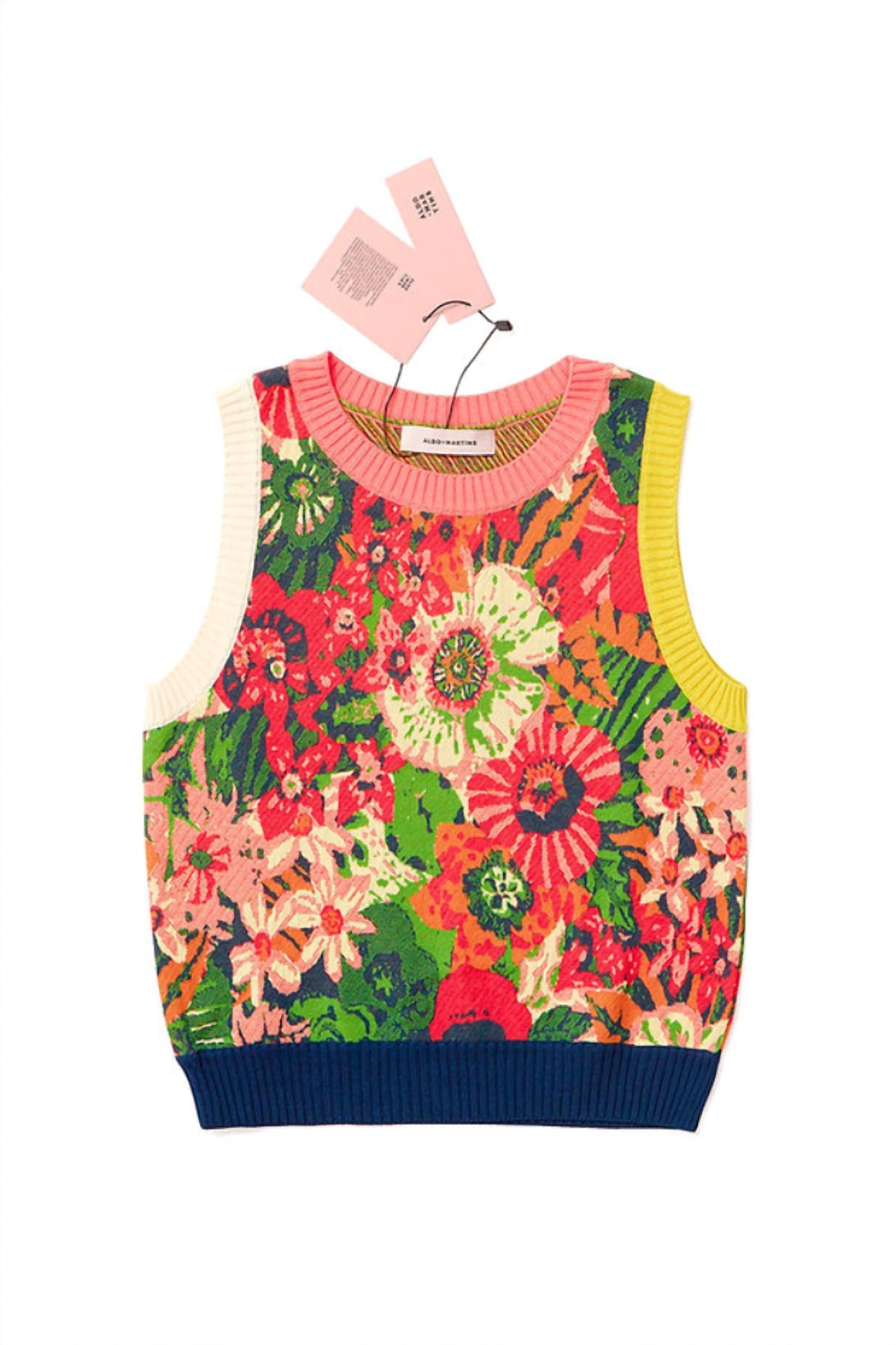 Яркий цветочный принт. Слегка укороченный. Без рукавов. Модель надевается через голову. 100% хлопок. Машинная стирка в холодной воде.