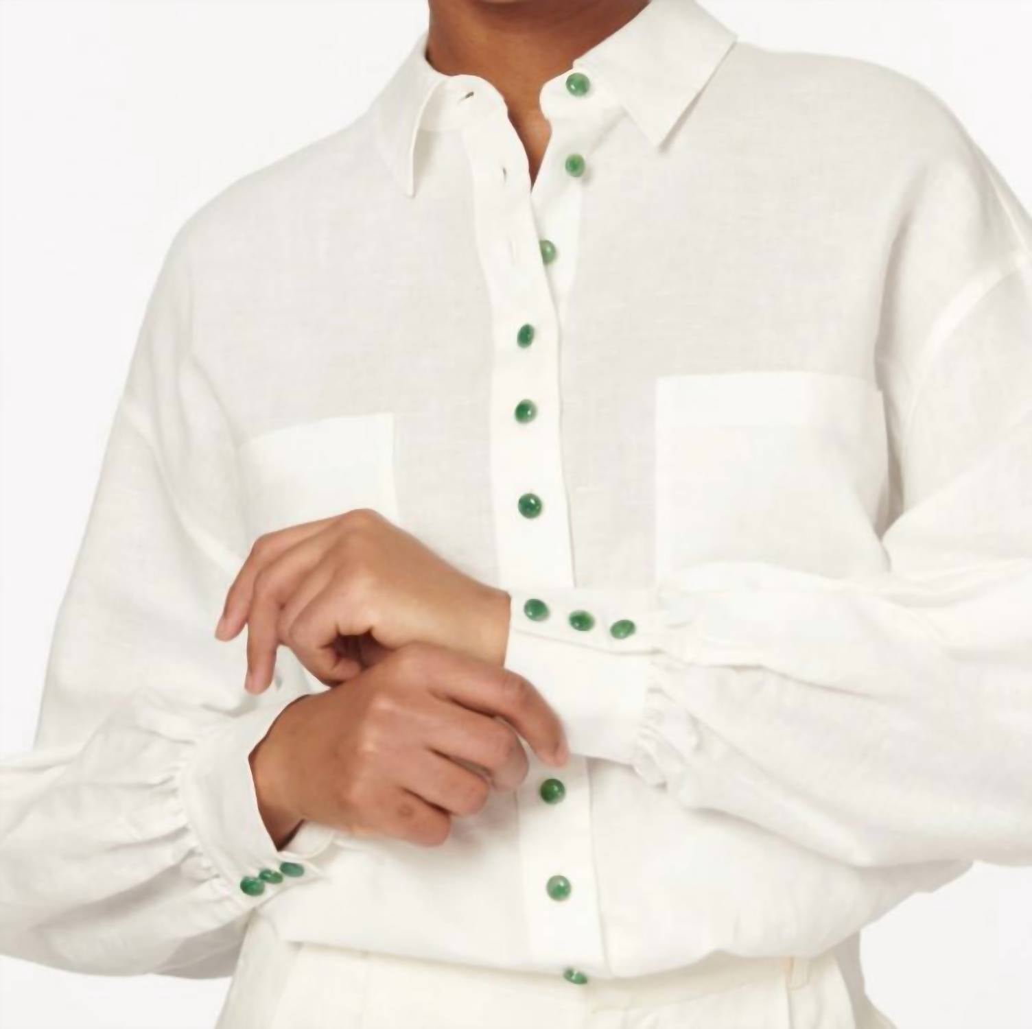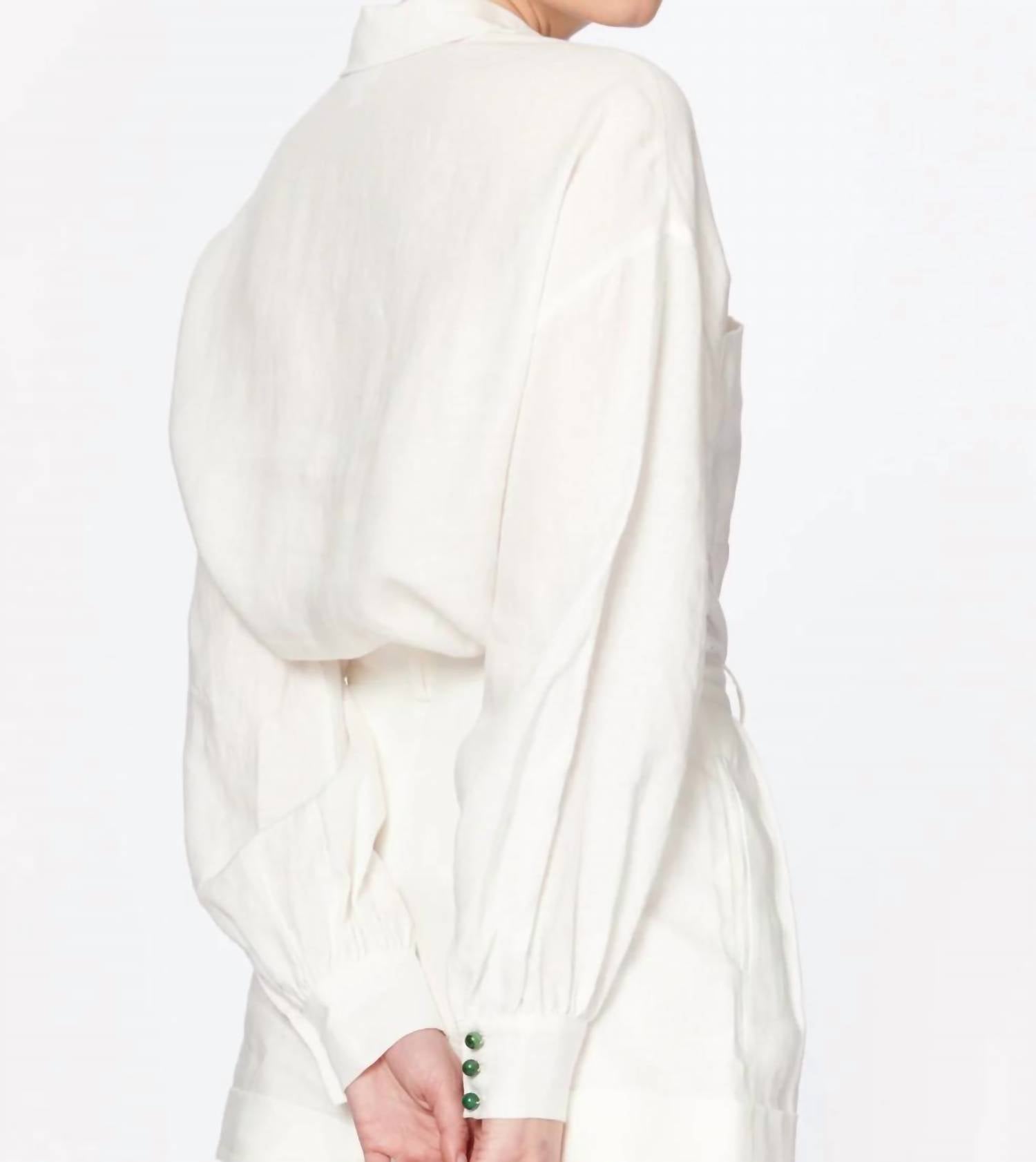 Изготовлена из мягкого льна. Эта блузка с воротником имеет объемные длинные рукава и изящно украшена застежкой на пуговицу из бирюзового камня, а также имеет накладные карманы. 100% лен. Только сухая чистка и отпаривание. Импортная. Свободный крой.
