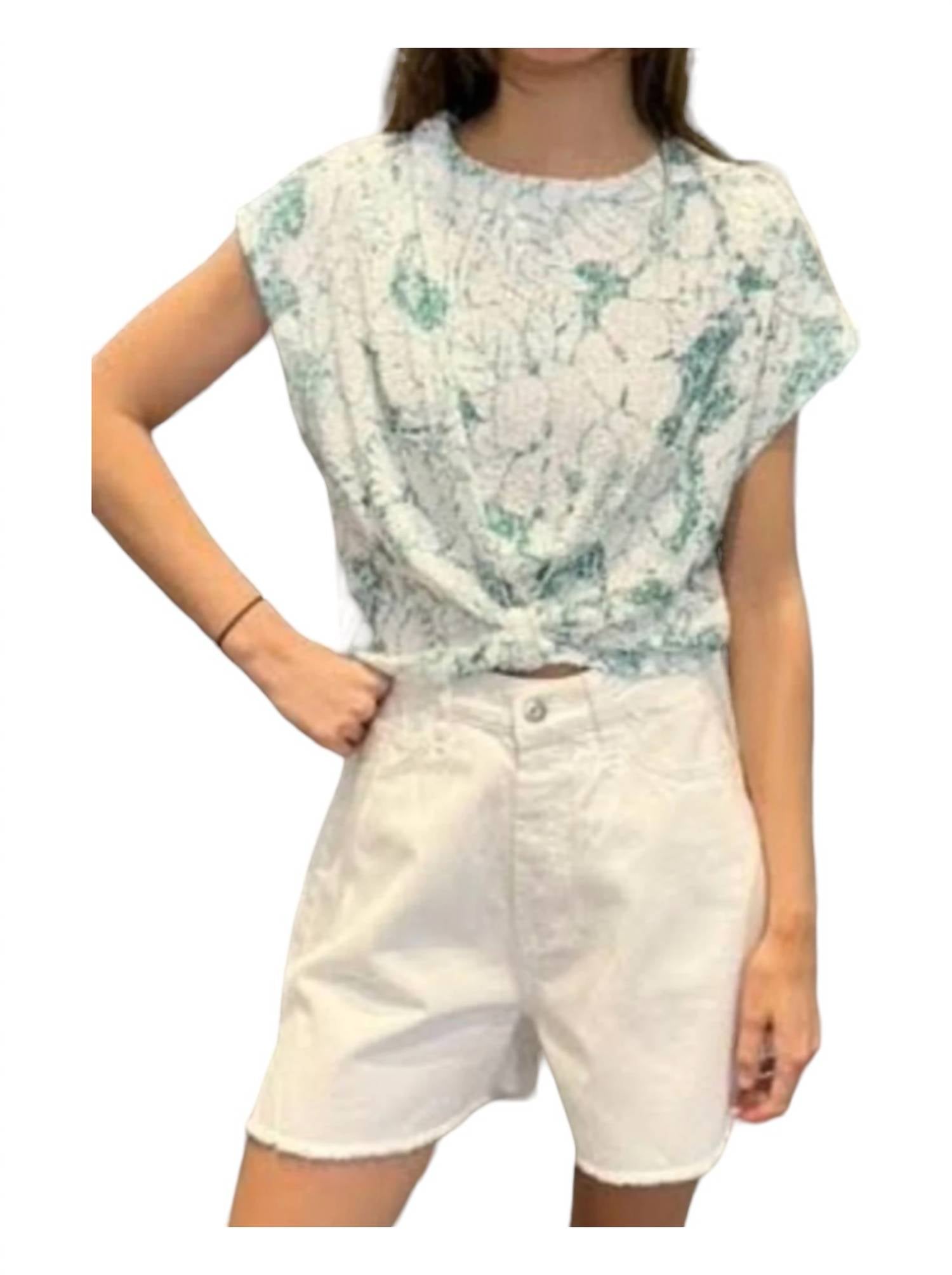 Короткие рукава. Блузка с круглым вырезом и цветочным узором. Оттенки зеленого и белого. Легкая ткань, свободный крой. Соответствует размеру. 100% полиэстер.