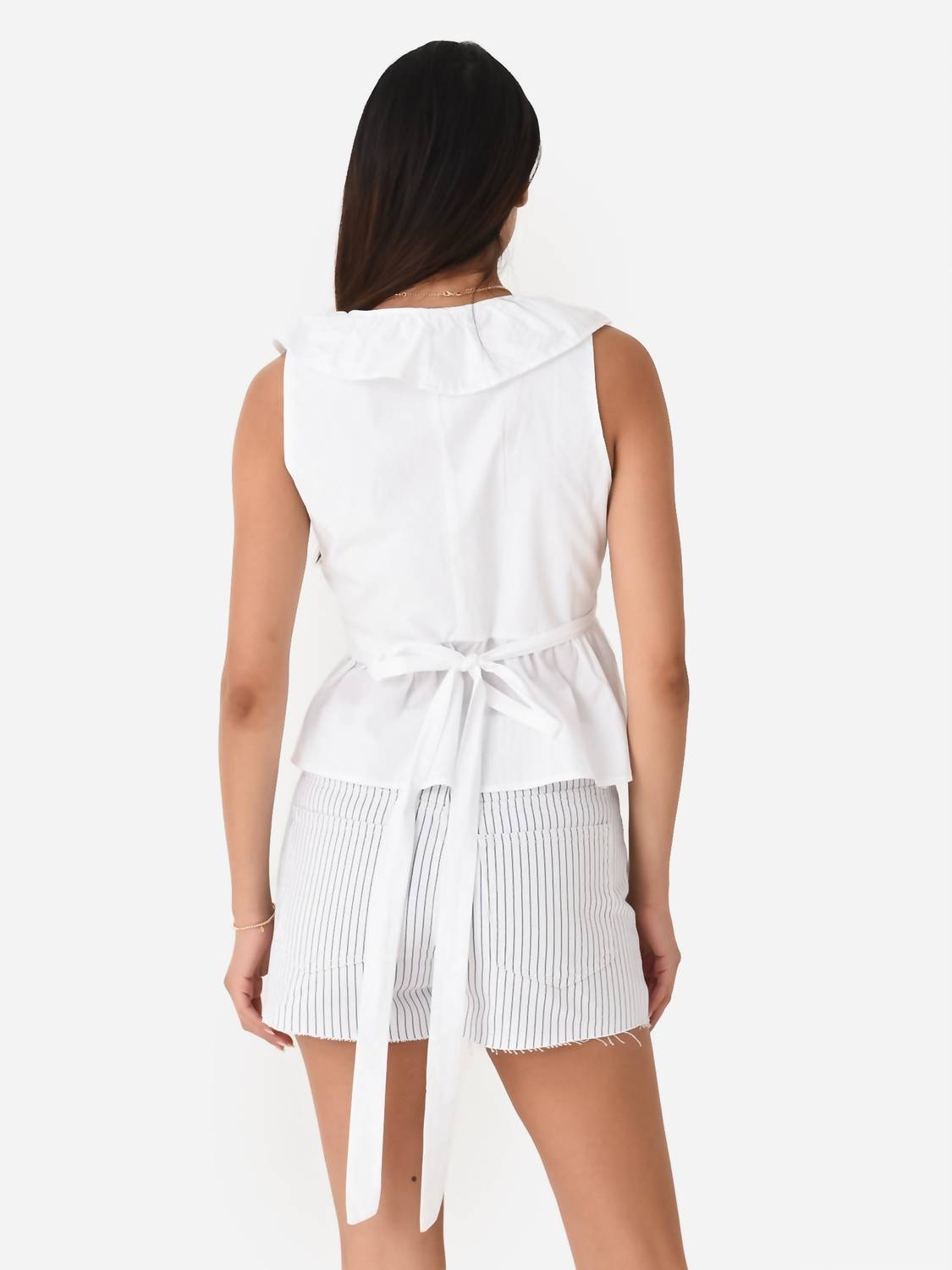 Топ без рукавов с глубоким V-образным вырезом, с оборкой сверху, завязывающимся поясом и баской по низу в силуэте с запахом. Изготовлен из 100% хлопка с классическим кроем, на модели размер Small. Параметры модели: рост 5 футов 10 дюймов | бюст 32B | талия 26,5 дюймов | бедра 38 дюймов | размер платья 2-4 (US).