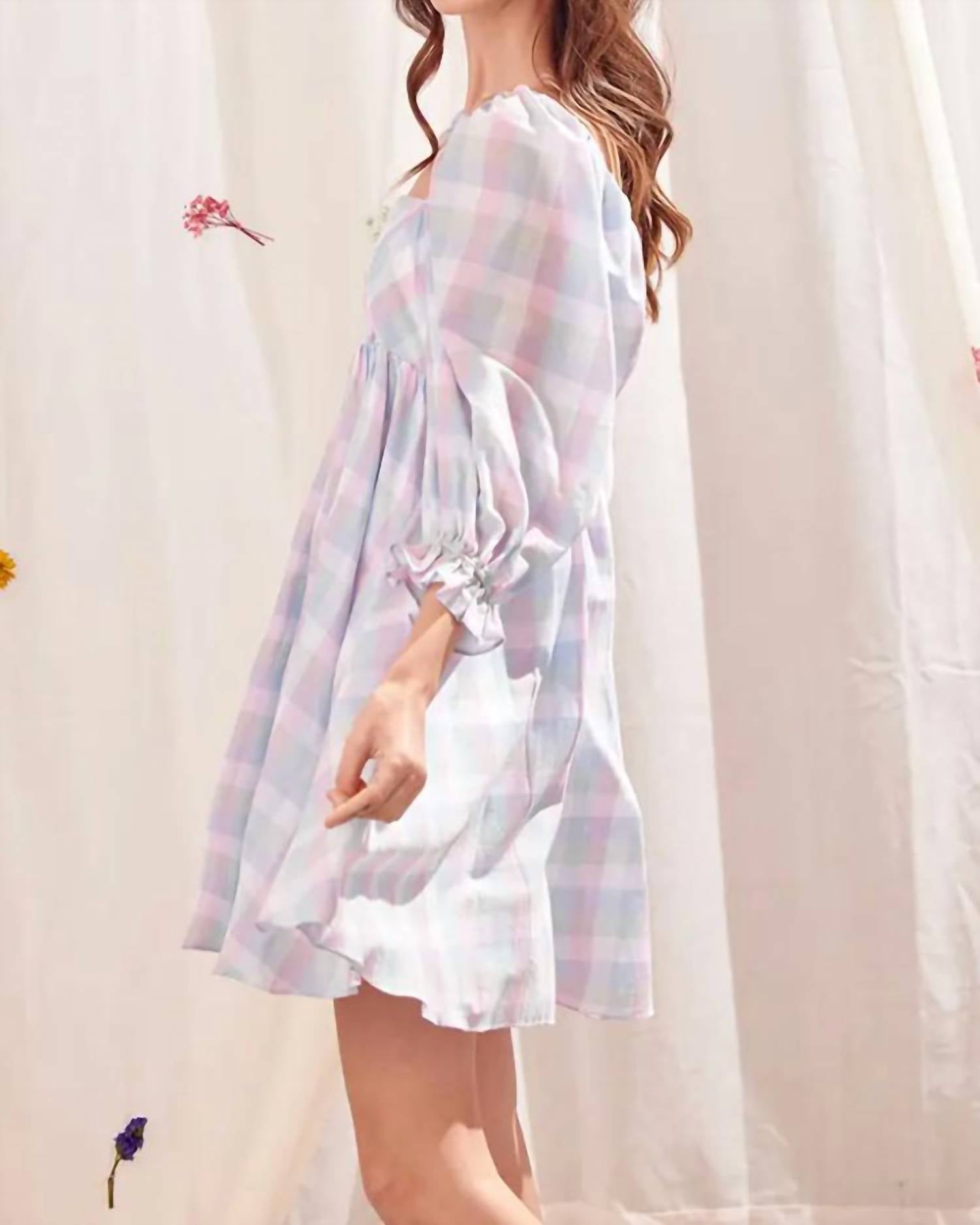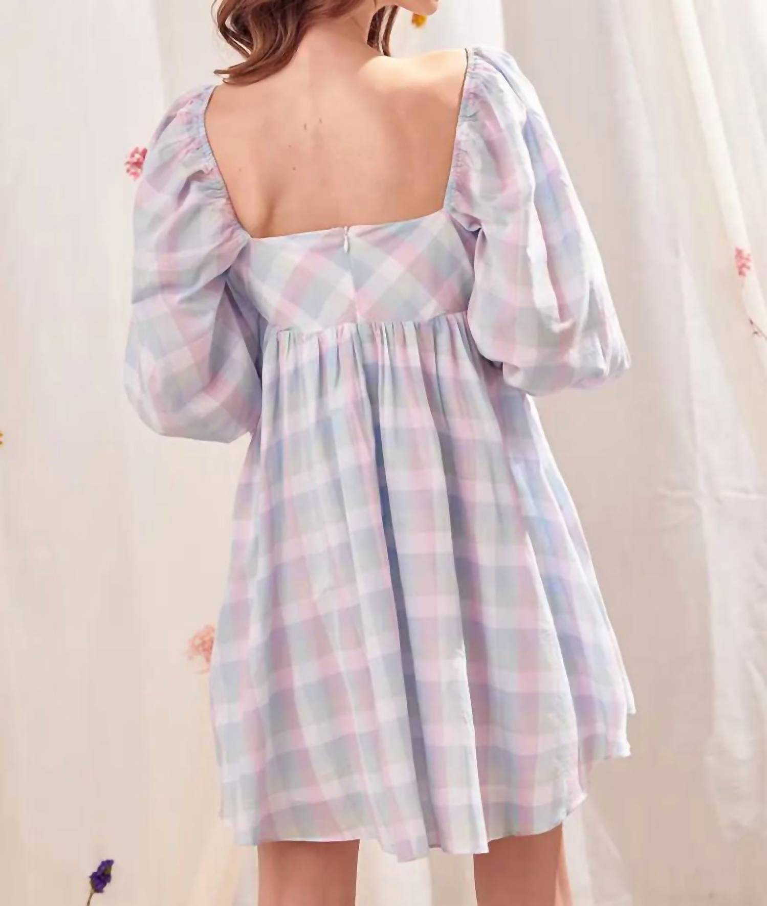 Короткое и воздушное платье для теплых дней. Разноцветное клетчатое мини-платье в стиле бэби-долл. На груди видны вытачки спереди. Также на нем видны рукава-фонарики 3/4 с оборками на манжетах, квадратный вырез спереди и сзади и потайная молния сзади.