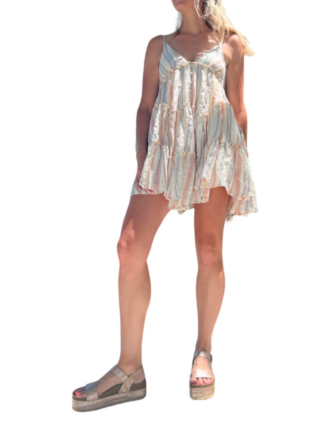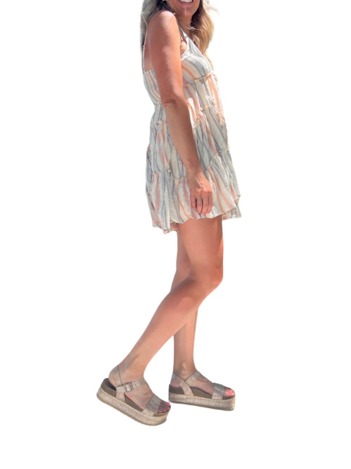 Bobbi Ann — это хлопковое марлевое полосатое мини-платье с тонкими бретельками, оборками и застежкой на пуговицы спереди. Веселое и кокетливое, оно идеально подходит для летних или осенних мероприятий.