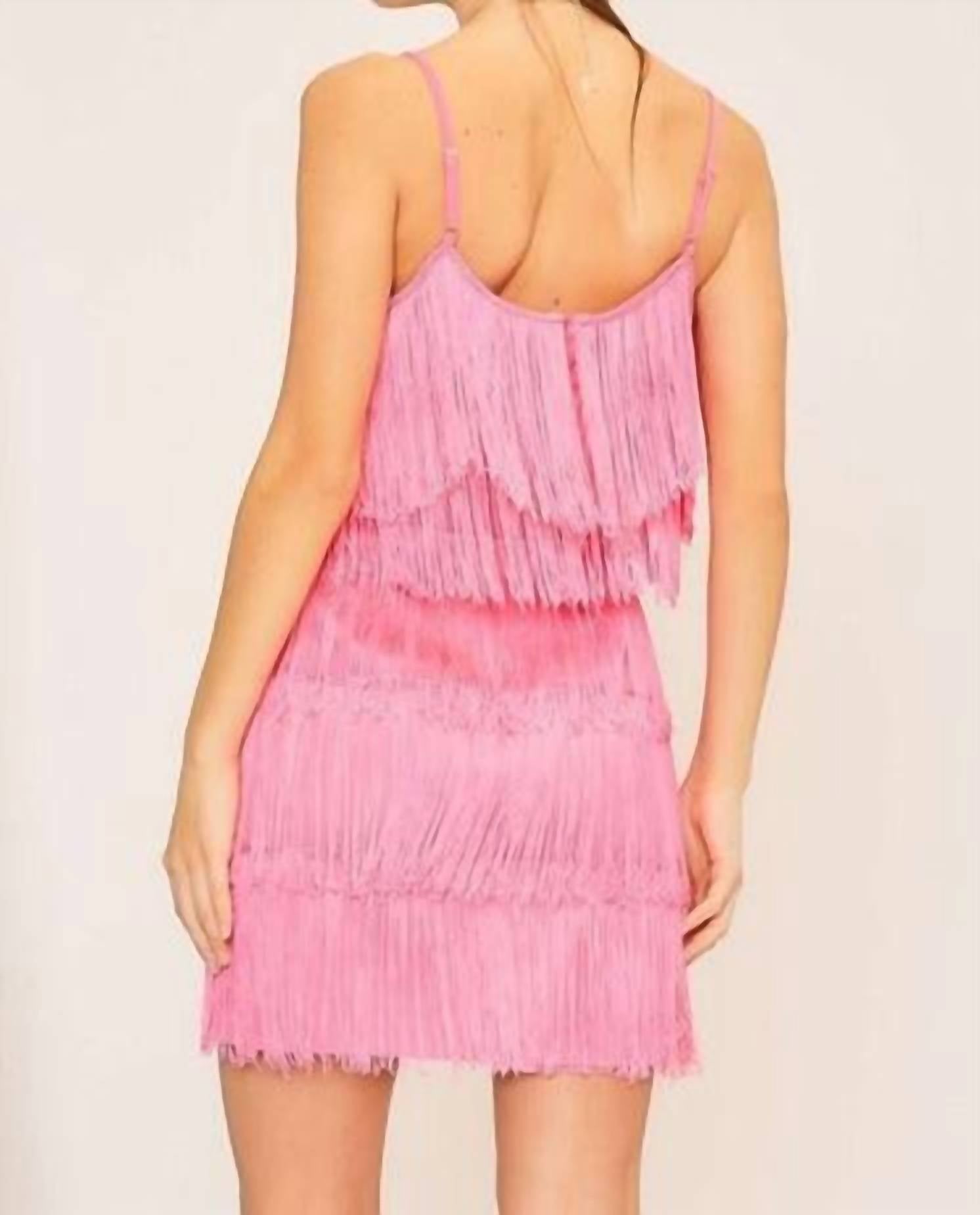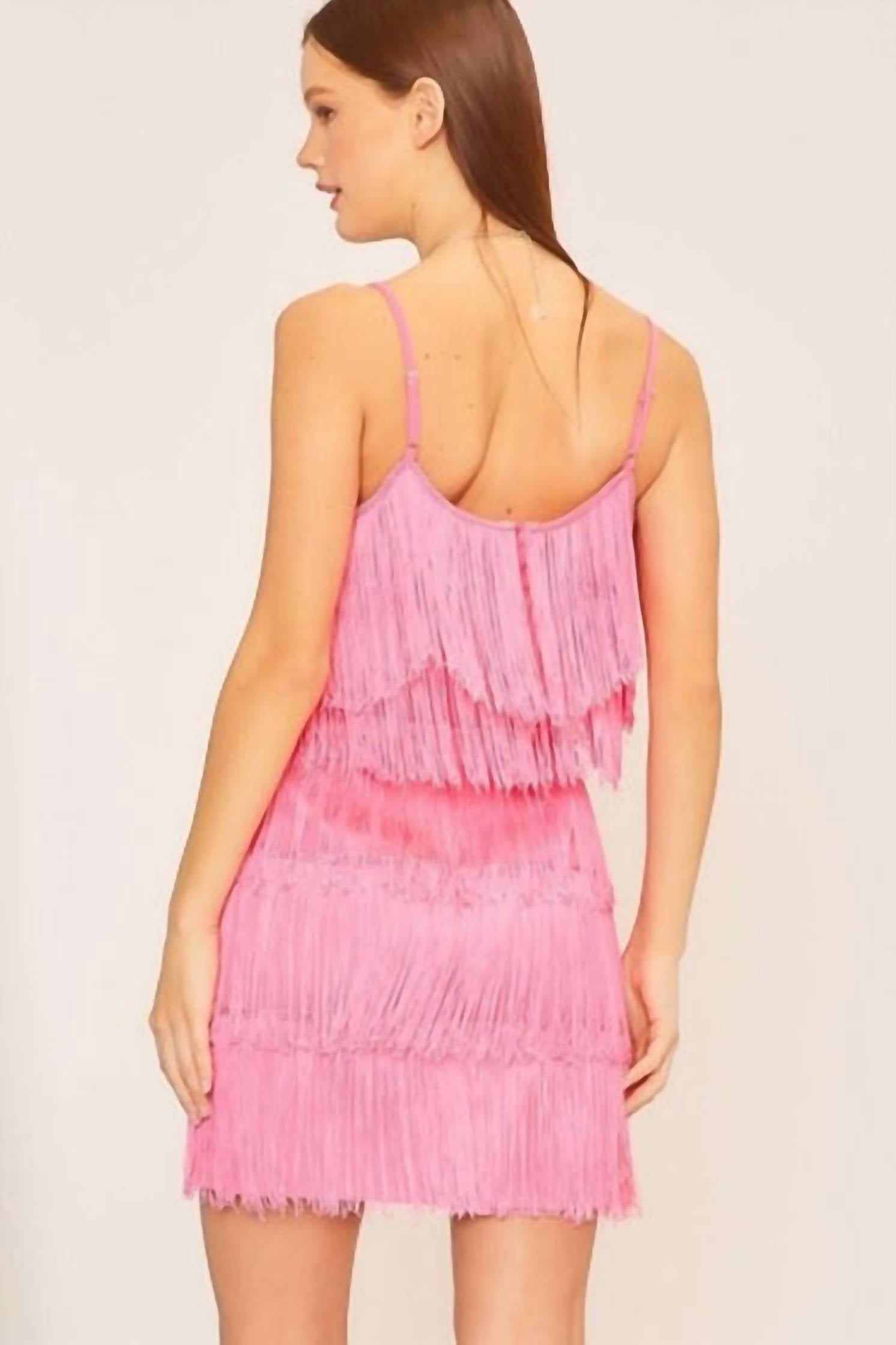 Двигайтесь в своем собственном ритме с этим розовым платьем с бахромой от Main Strip. С сетчатой отделкой, V-образным вырезом и отделкой на бретельках это платье идеально подходит для первых ночей на плитке.