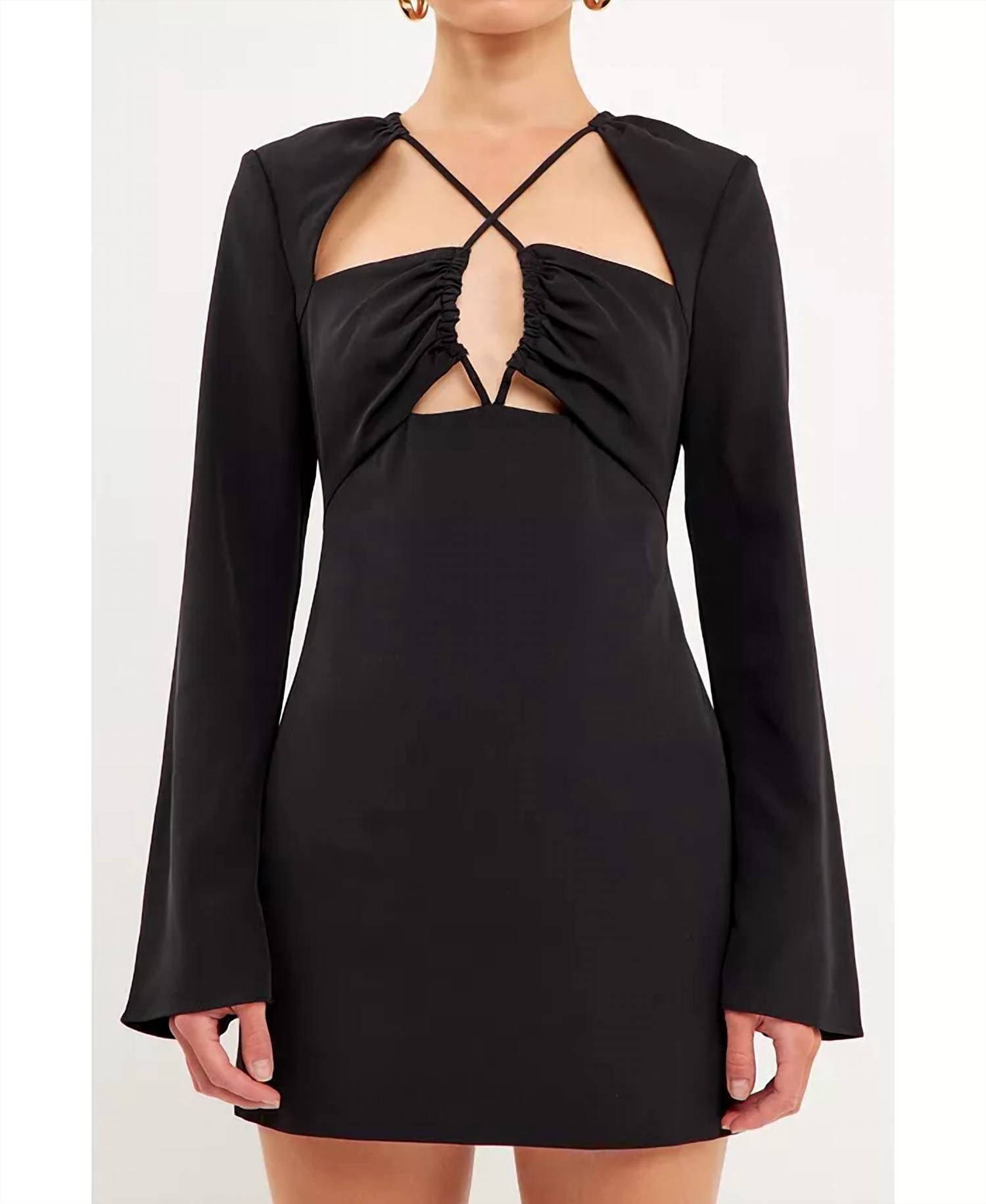Мини-платье с длинными рукавами. Забавный вырез с небольшими расклешенными рукавами. Перекрестный вырез на бретелях. Приталенный. Мягкие плечи. Верхний слой 100% полиэстер. Подкладка 95% полиэстер. 5% спандекс.