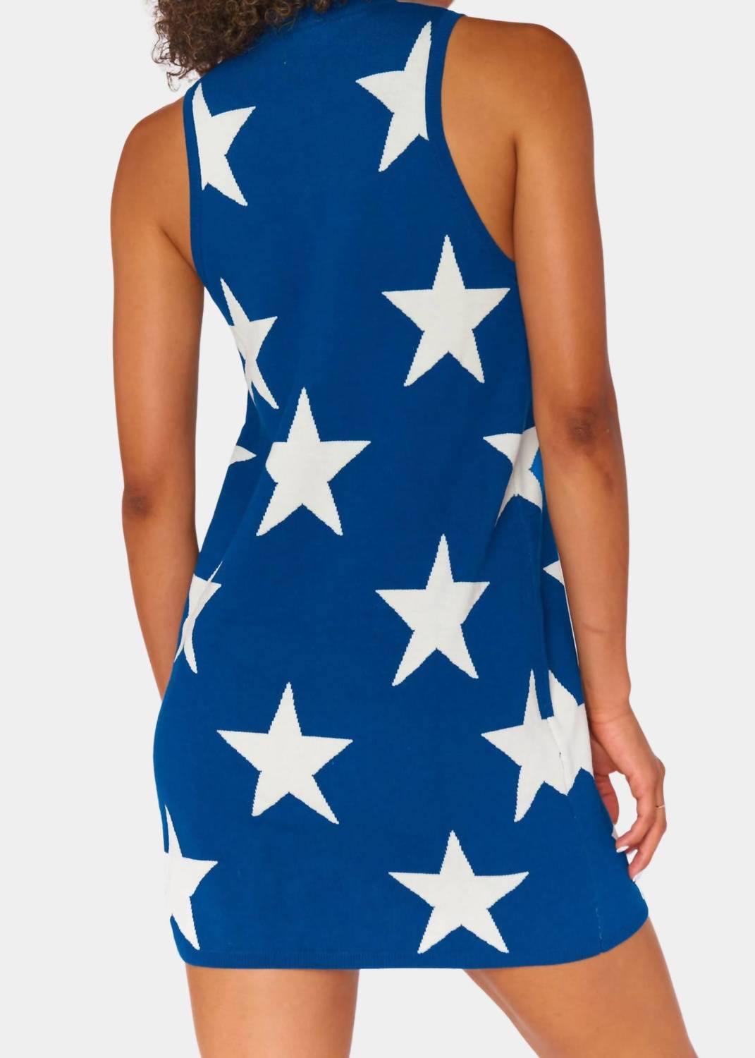 Темно-синее мини-чудо. Украшено россыпью звездных узоров. Спроектировано с привлекательным воротником-стойкой и шикарной застежкой-молнией. Без рукавов. Обещает сочетание комфорта и привлекательности. Изготовлено с тщательным вниманием к деталям.