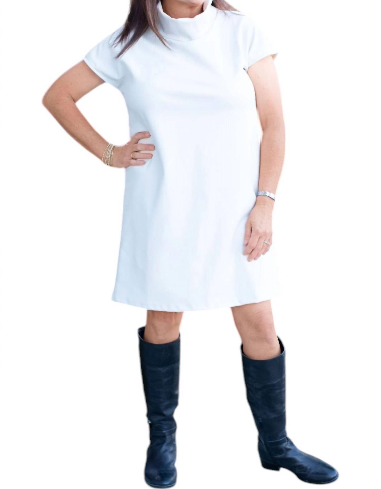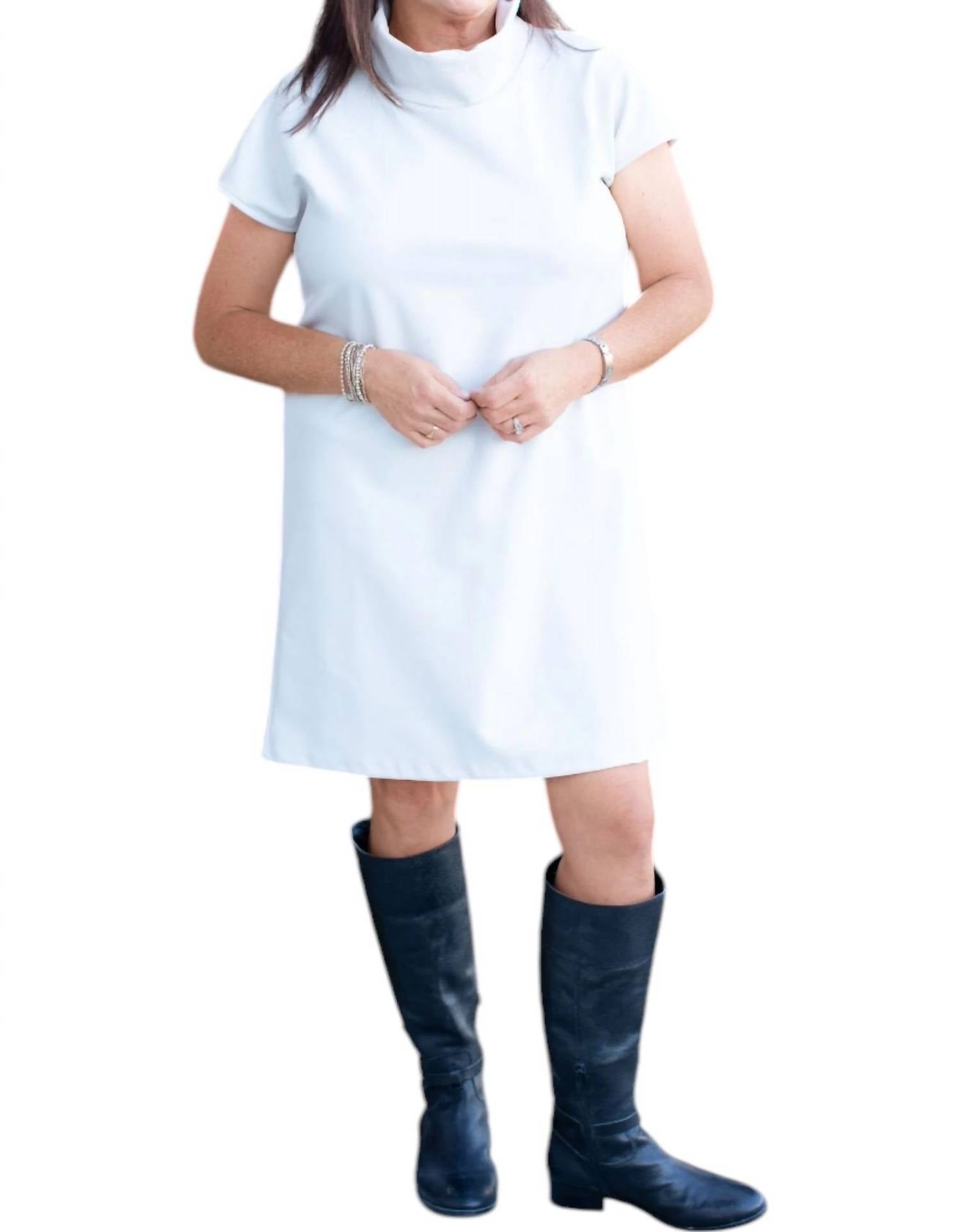 Шикарное ванильное платье-трапеция из искусственной кожи для эффектного образа. С короткими рукавами и стильной имитацией водолазки. Обеспечивает как комфорт, так и стиль. С удобной застежкой-липучкой.