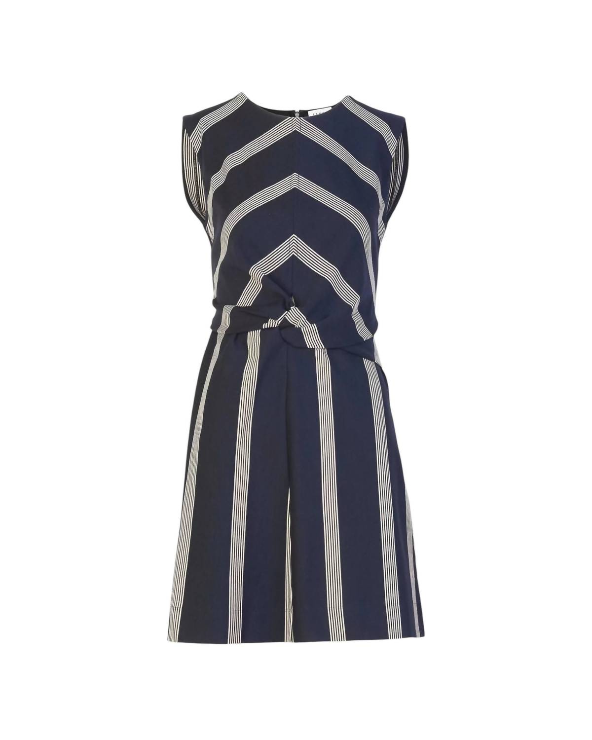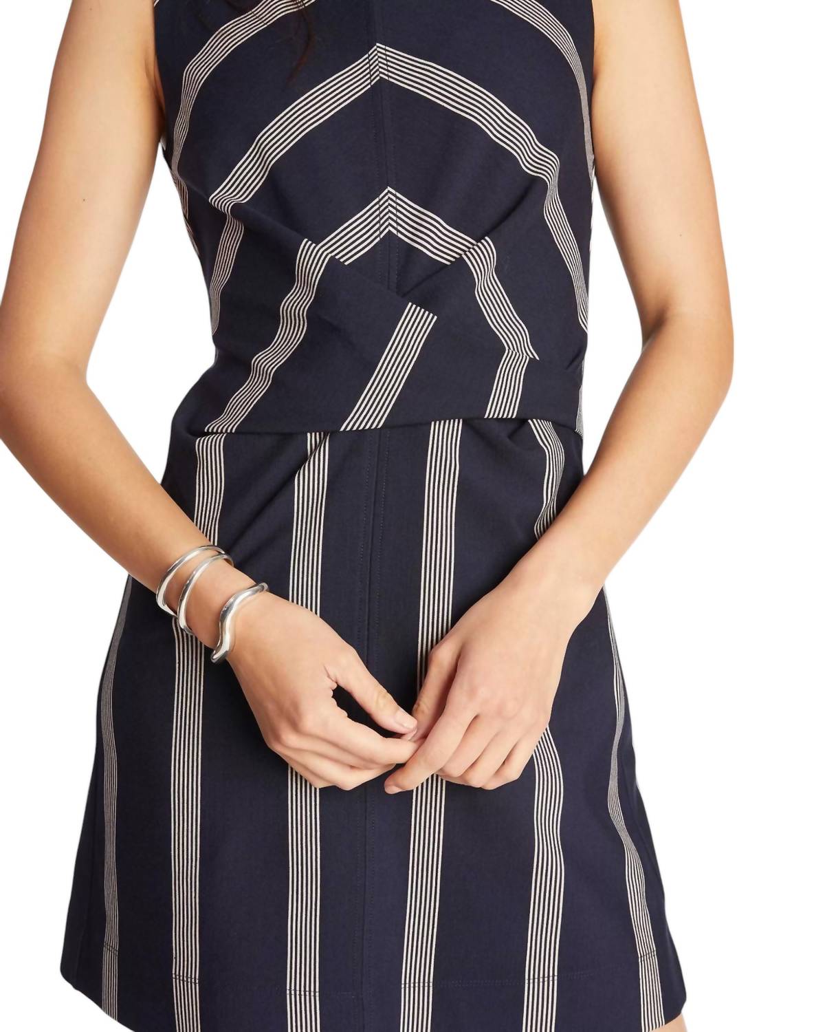 Это короткое платье Theo имеет лиф без рукавов с шевроном, пояс крест-накрест и структурированный силуэт А-силуэта. Изготовлено из смеси 62% вискозы, 33% нейлона, 5% эластана, имеет скрытую застежку-молнию для придания изысканности.