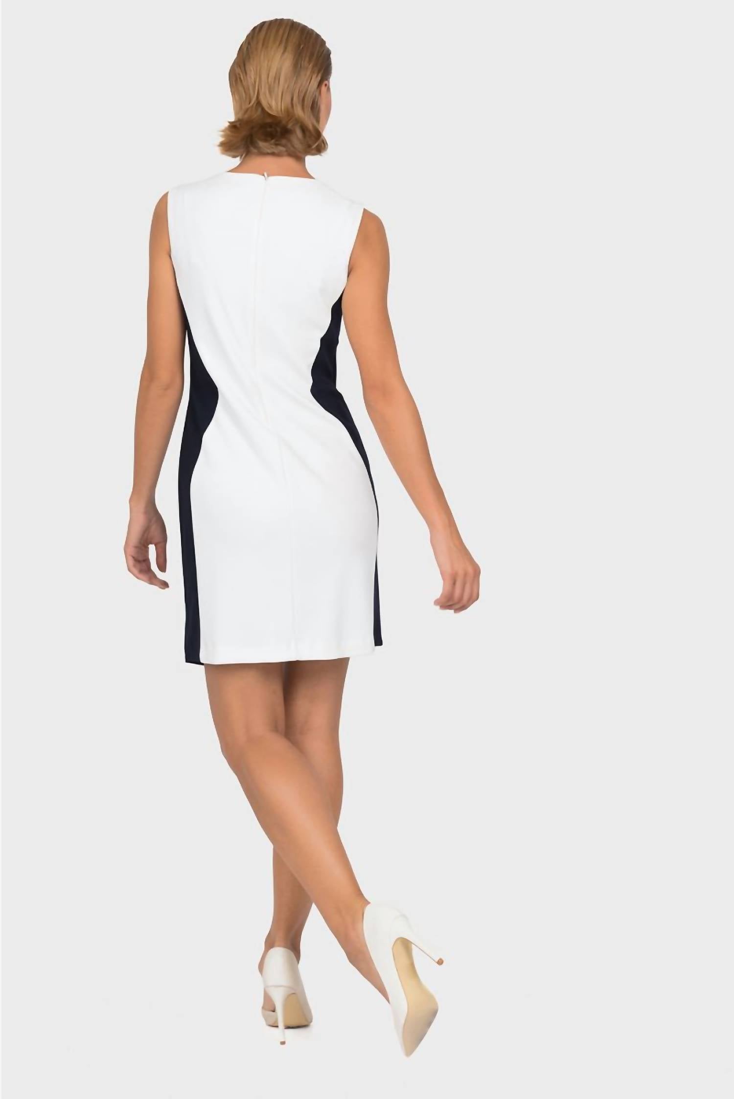 Это платье от Joseph Ribkoff с жилеткой спереди, застегивающейся на одну пуговицу, имеет подол до колена, вид без рукавов с отделкой люверсами и округлым вырезом горловины. 96% полиэстер, 4% спандекс. Застежка-молния сзади. А-образный силуэт.
