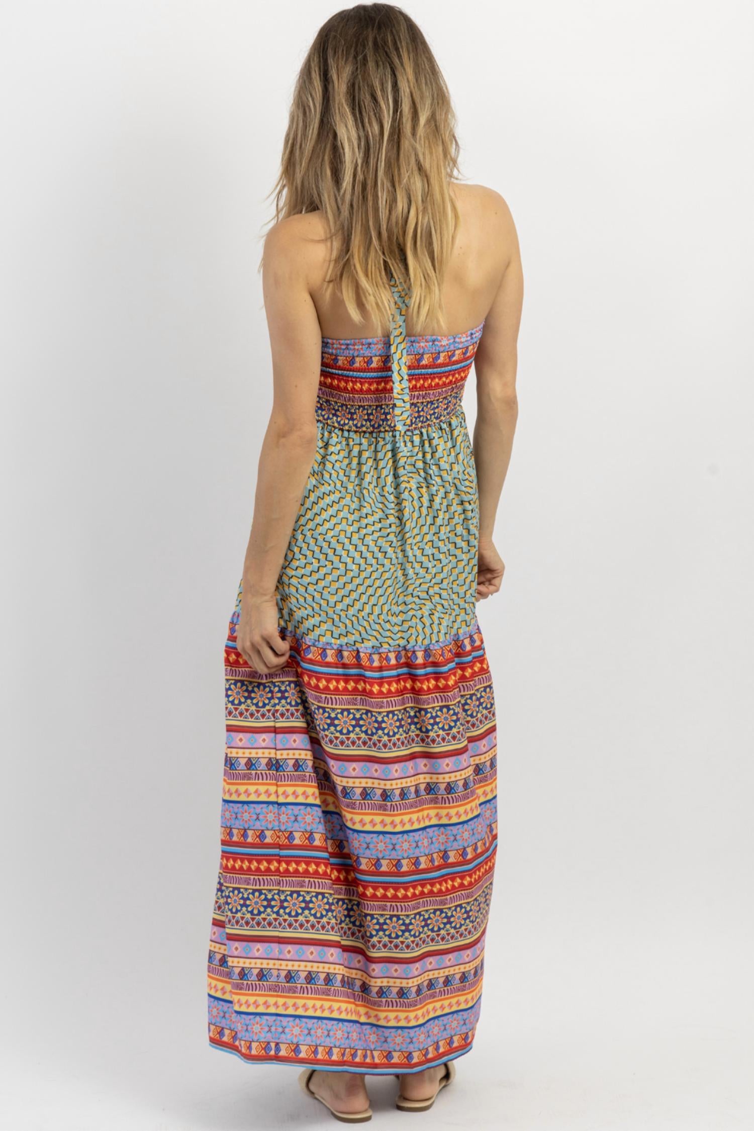 Присборенная спинка, геометрический принт, халтер-ворот, завязывающийся на шее воротник, длина макси, без рукавов. 100% полиэстер. На модели размер small. Рост 5'8. Размер платья 2.
