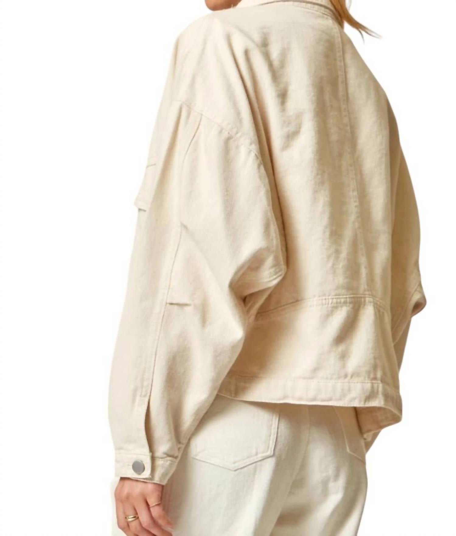 Эта джинсовая куртка имеет рукава-летучая мышь с плиссировкой, воротниковую конструкцию, двубортный фасон и застежку на пуговицы. Она сделана из 88% хлопка и 12% полиэстера.