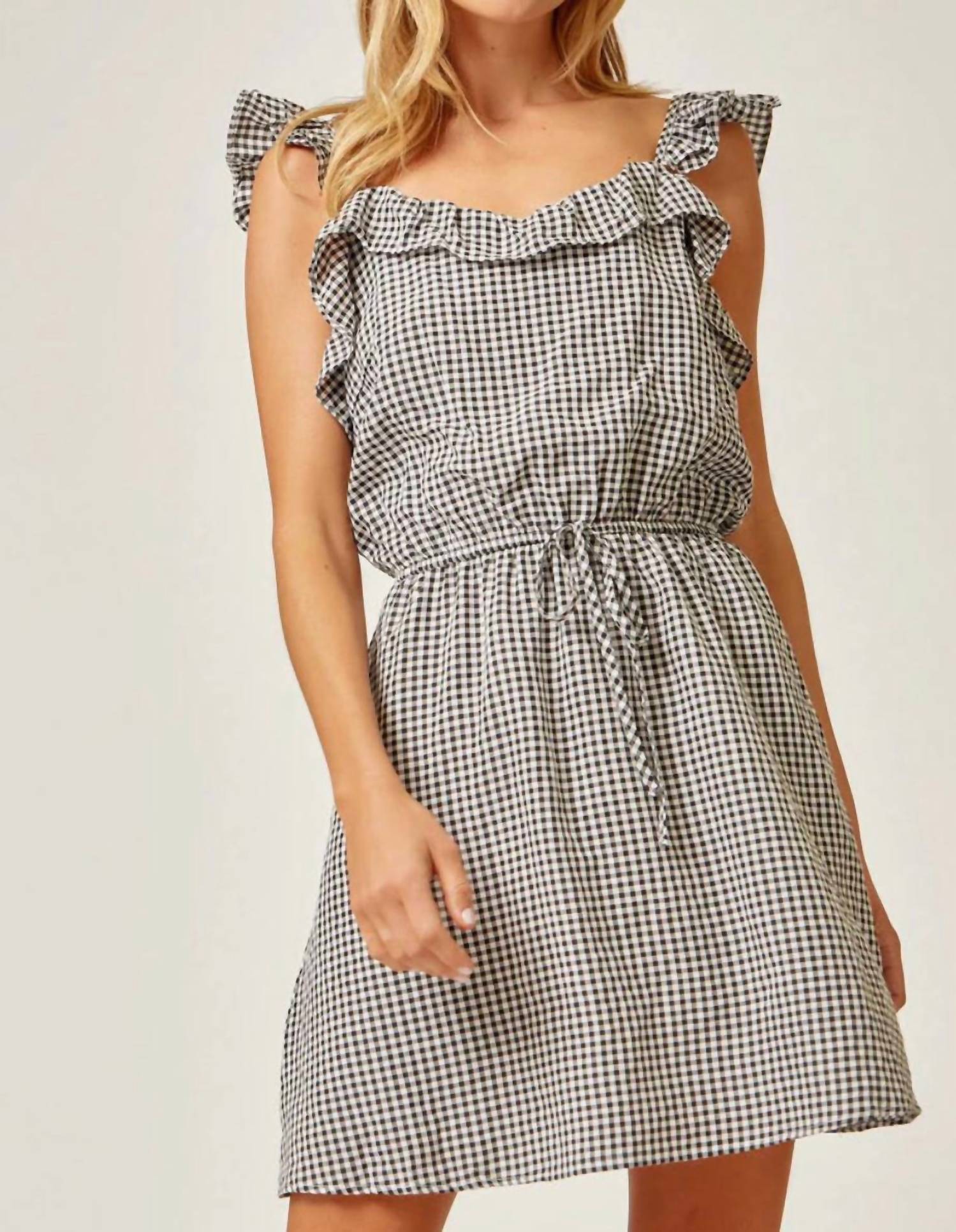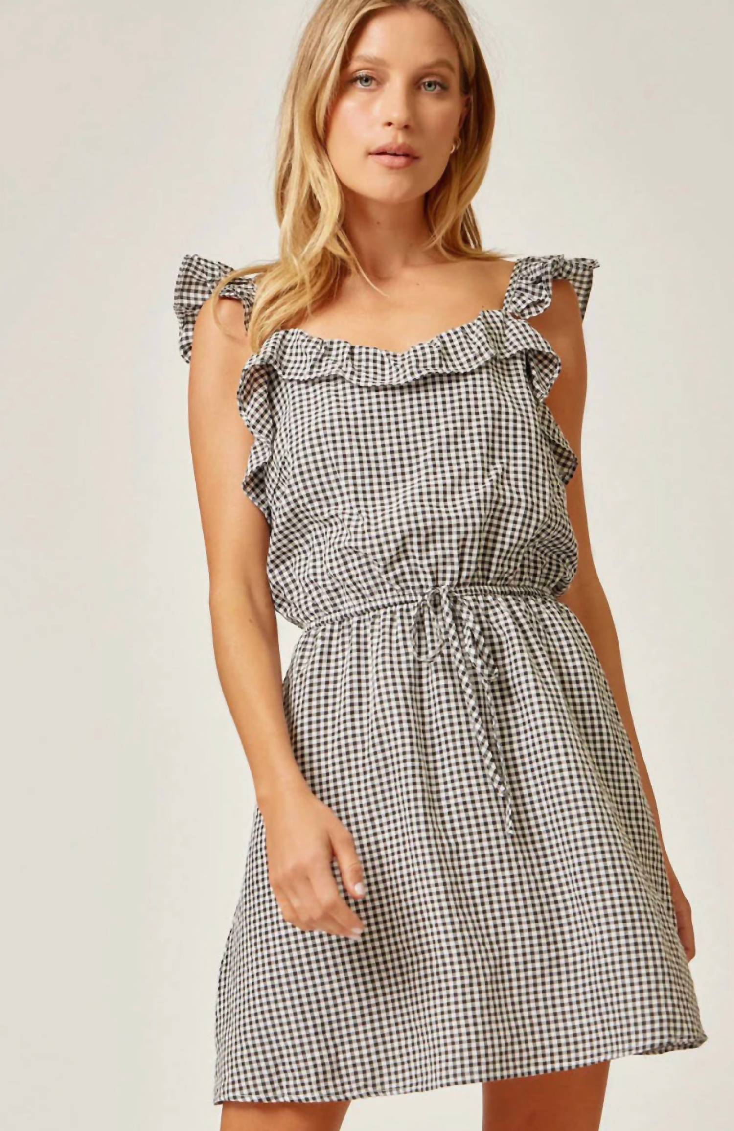 Легкая ткань в клетку. Круглый вырез с оборкой. А-силуэт. Эластичный пояс с имитацией завязки. На подкладке. 60% вискоза, 40% полиэстер. Стирать в холодной воде, сушить в подвешенном состоянии. Соответствует размеру, слегка притален в груди, струящийся по всей длине.