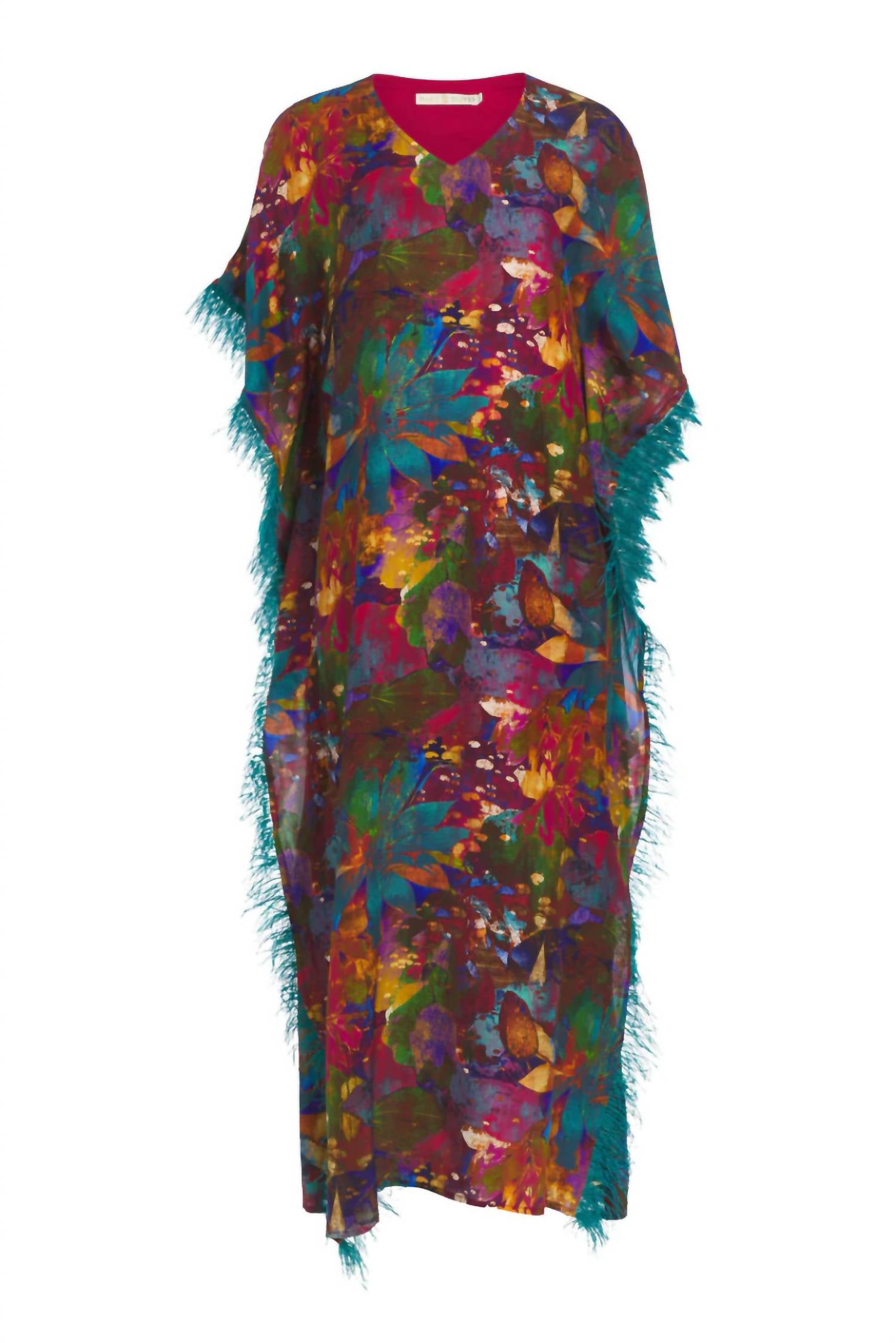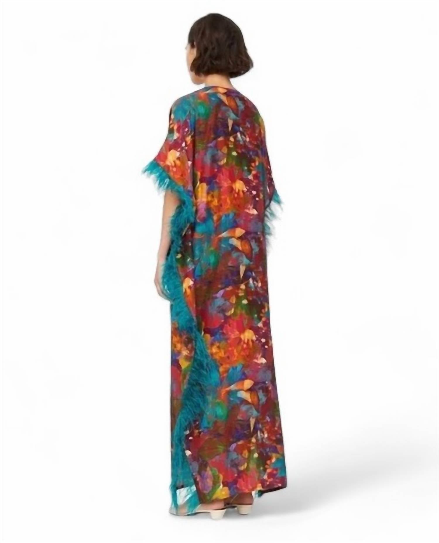 Это платье с рукавами «летучая мышь» и V-образным вырезом, украшенным перьевой отделкой бирюзового цвета. Оно на подкладке и сконструировано в силуэте колонны с длиной макси, демонстрируя драгоценный рисунок Lotus. Изготовлено из 100% шелка, имеет длину около 54 дюймов и соответствует размеру.