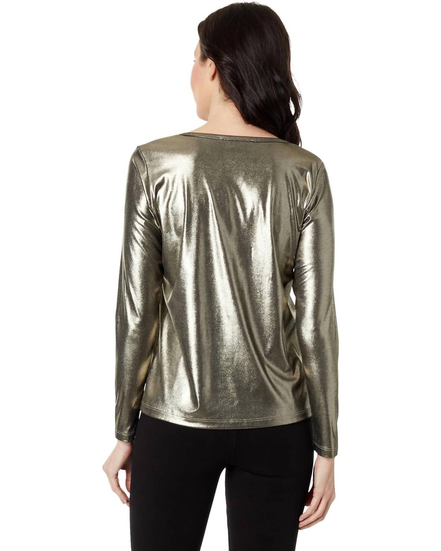 Мягкая мерцающая ткань. Металлическая отделка. Круглый вырез горловины. Длинные рукава. Приталенный силуэт. 95% полиэстер, 5% спандекс.
