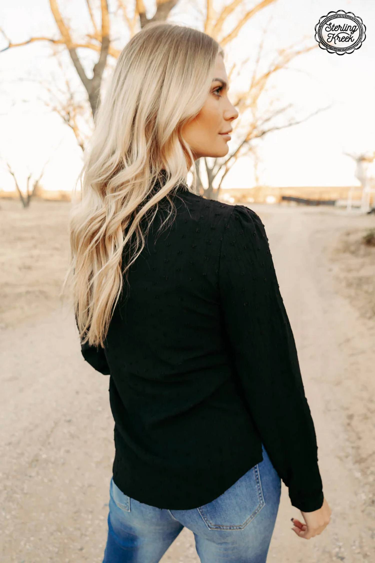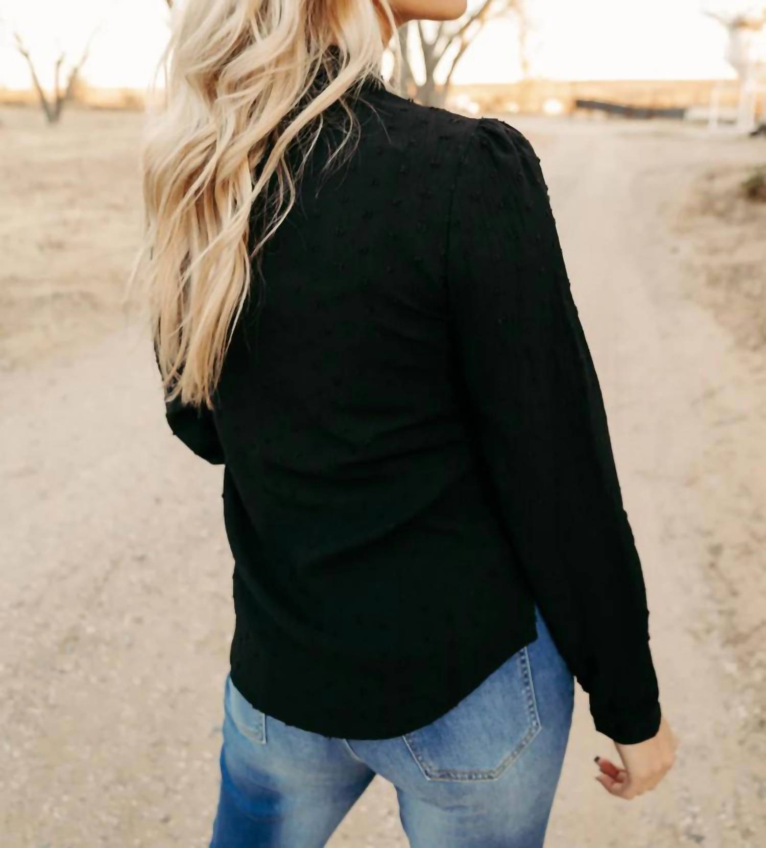 Ткань в горошек. Длинные рукава. Полная застежка на пуговицы спереди. Дерзкая завязка спереди. 100% полиэстер.