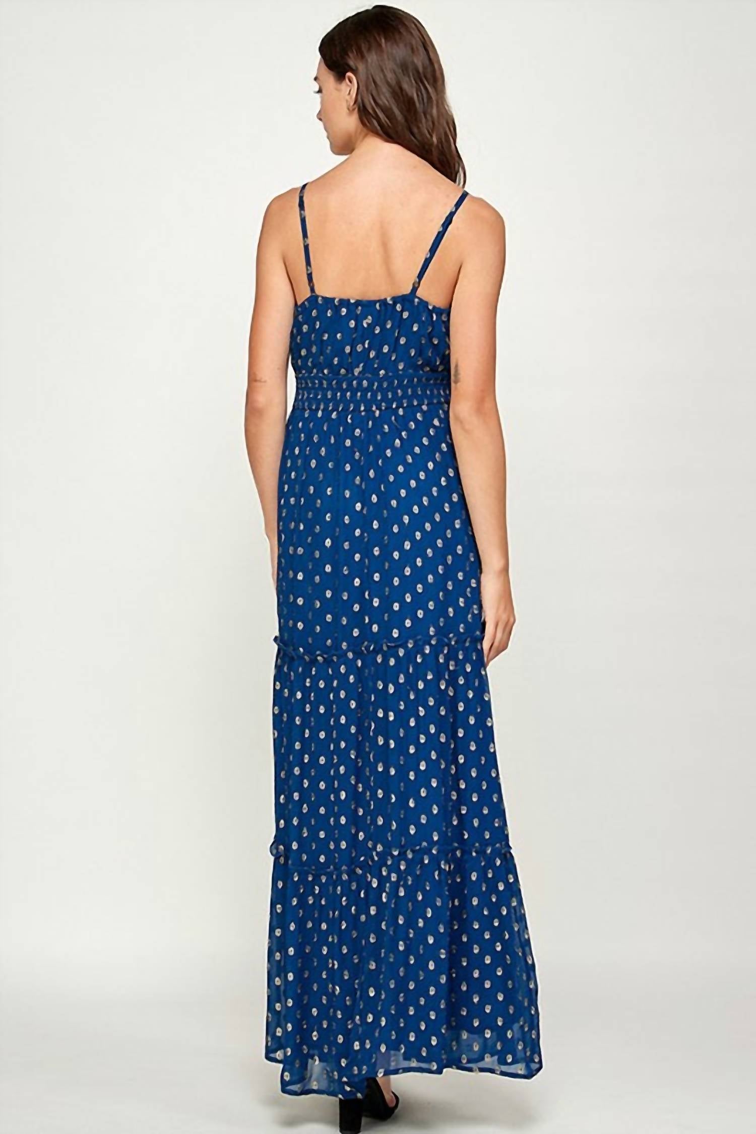 Струящееся макси-платье с вырезом спереди, многоуровневой юбкой и золотыми швейцарскими горошинами для дополнительной текстуры. 98% викоз, 2% люрекс; подкладка 100% вискоза. Рост модели 5 футов 9 дюймов, размер Small. S, M, L. Длина - 58”, 59”, 60”. Бюст - 30”, 32”, 34”. Талия - 22”, 27”, 35”.