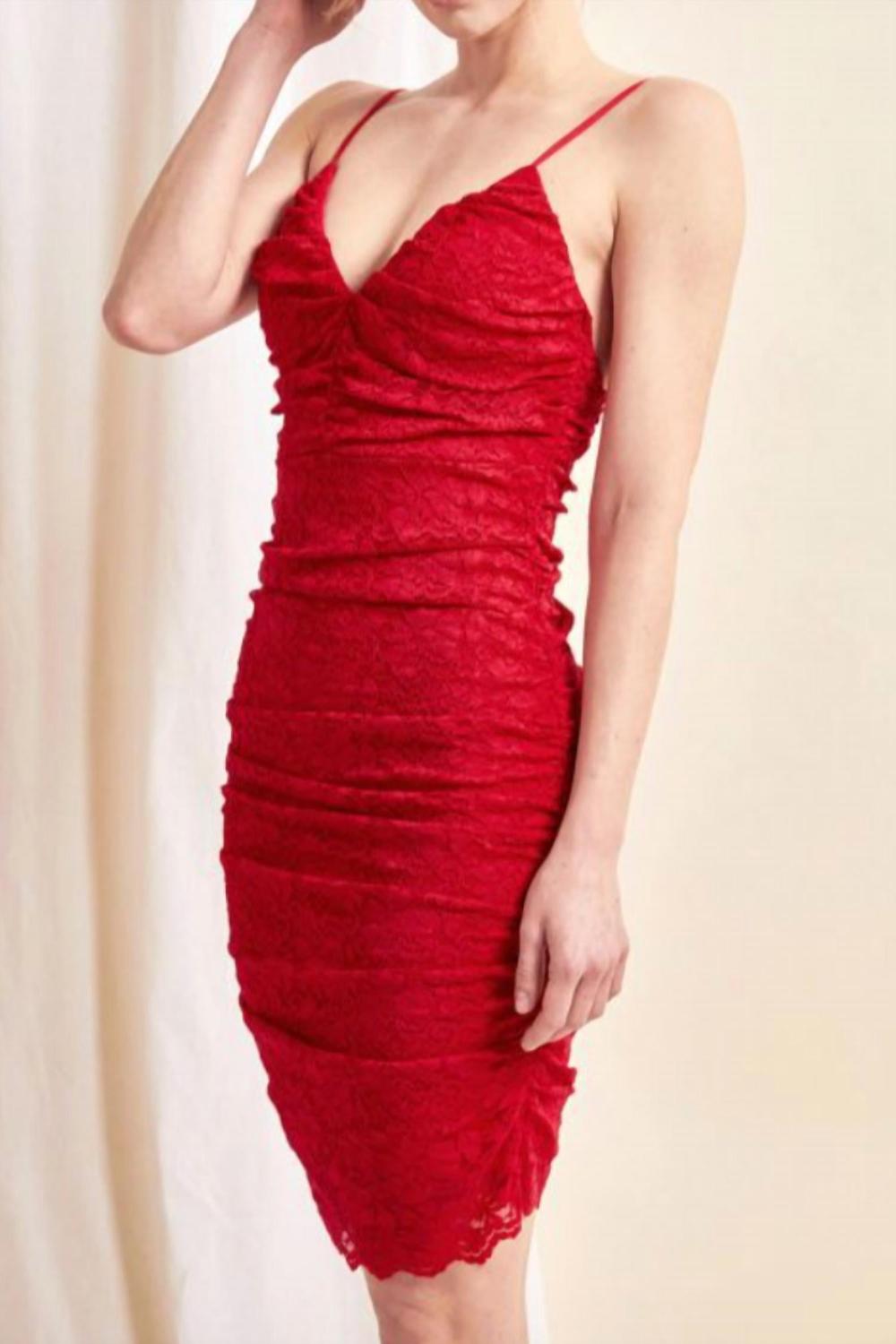 Короткое и воздушное платье для теплых дней. Узкое облегающее платье красного цвета со сборками и кружевом.