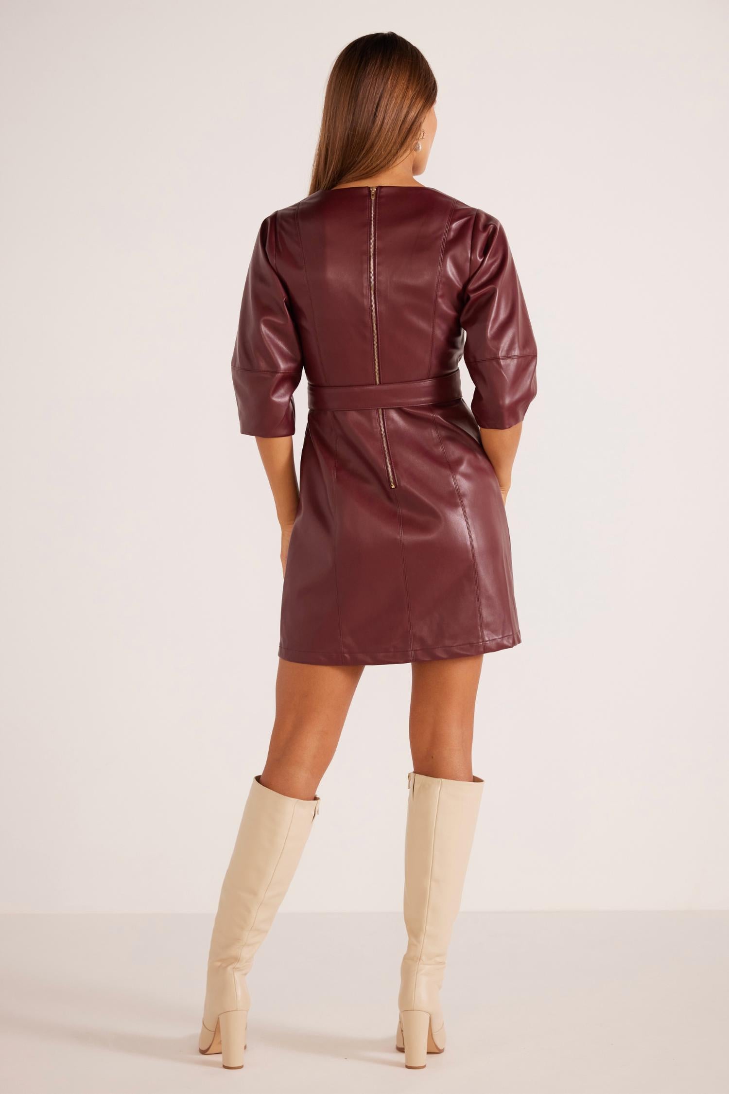 Искусственная кожа винного цвета и V-образный вырез. Талия затягивается. Молния сзади и удобная подкладка. Машинная стирка в холодной воде. 100% полиэстер.