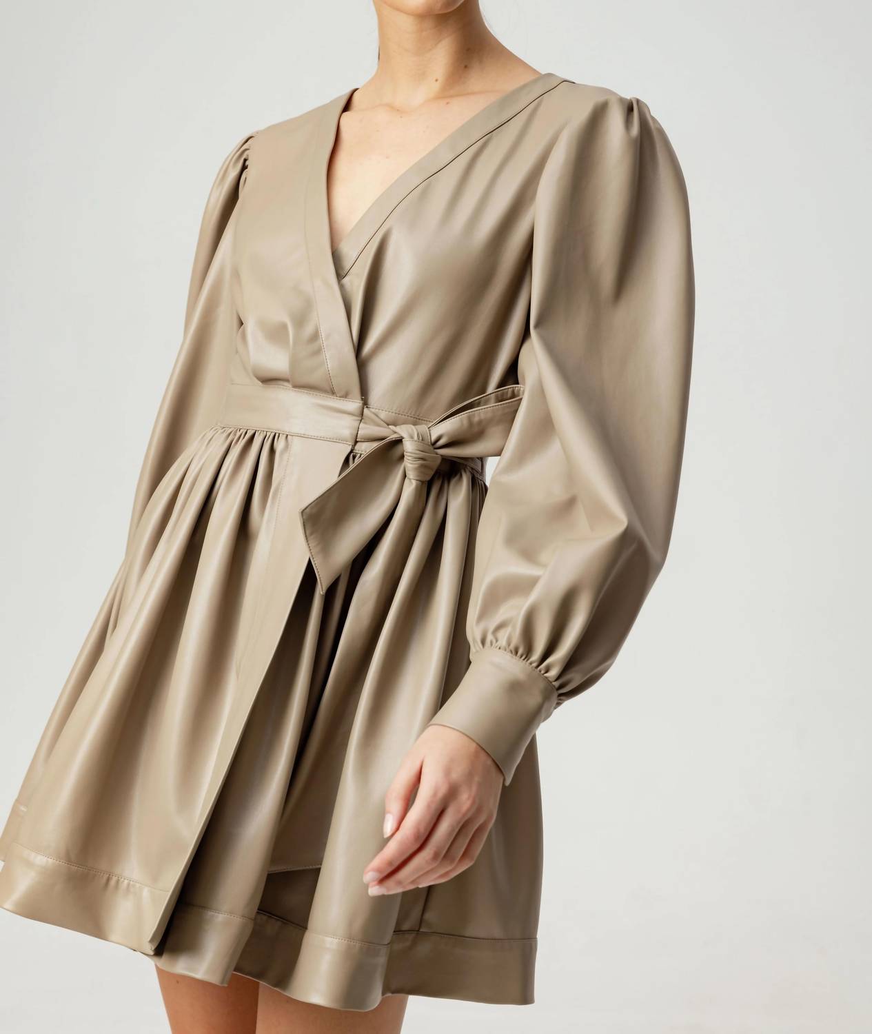 Короткое и воздушное платье для теплых дней. Это элегантное платье-халат из веганской кожи с пышной и женственной юбкой для создания привлекательного силуэта и рукавами-фонариками.