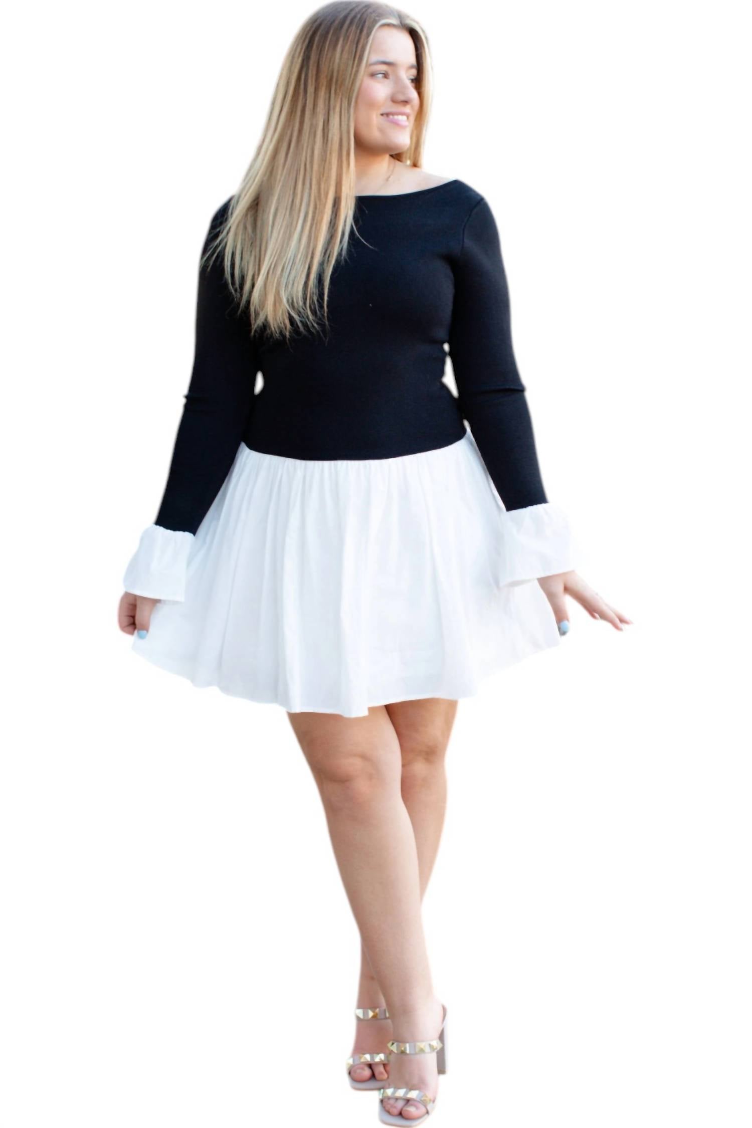 Непринужденная изысканность, демонстрирующая эффектное сочетание черного и белого. Длинные рукава и шикарный вырез-лодочка. Изготовлено из плотной поплиновой ткани. Легко сочетает комфорт и стиль. С удобной застежкой-липучкой. Универсальное платье А-силуэта.