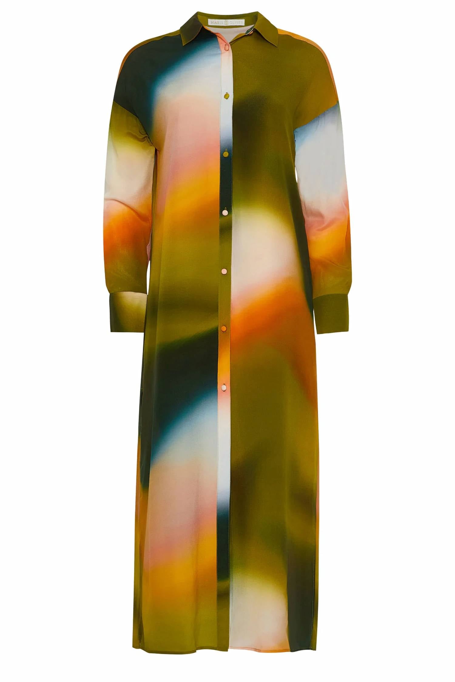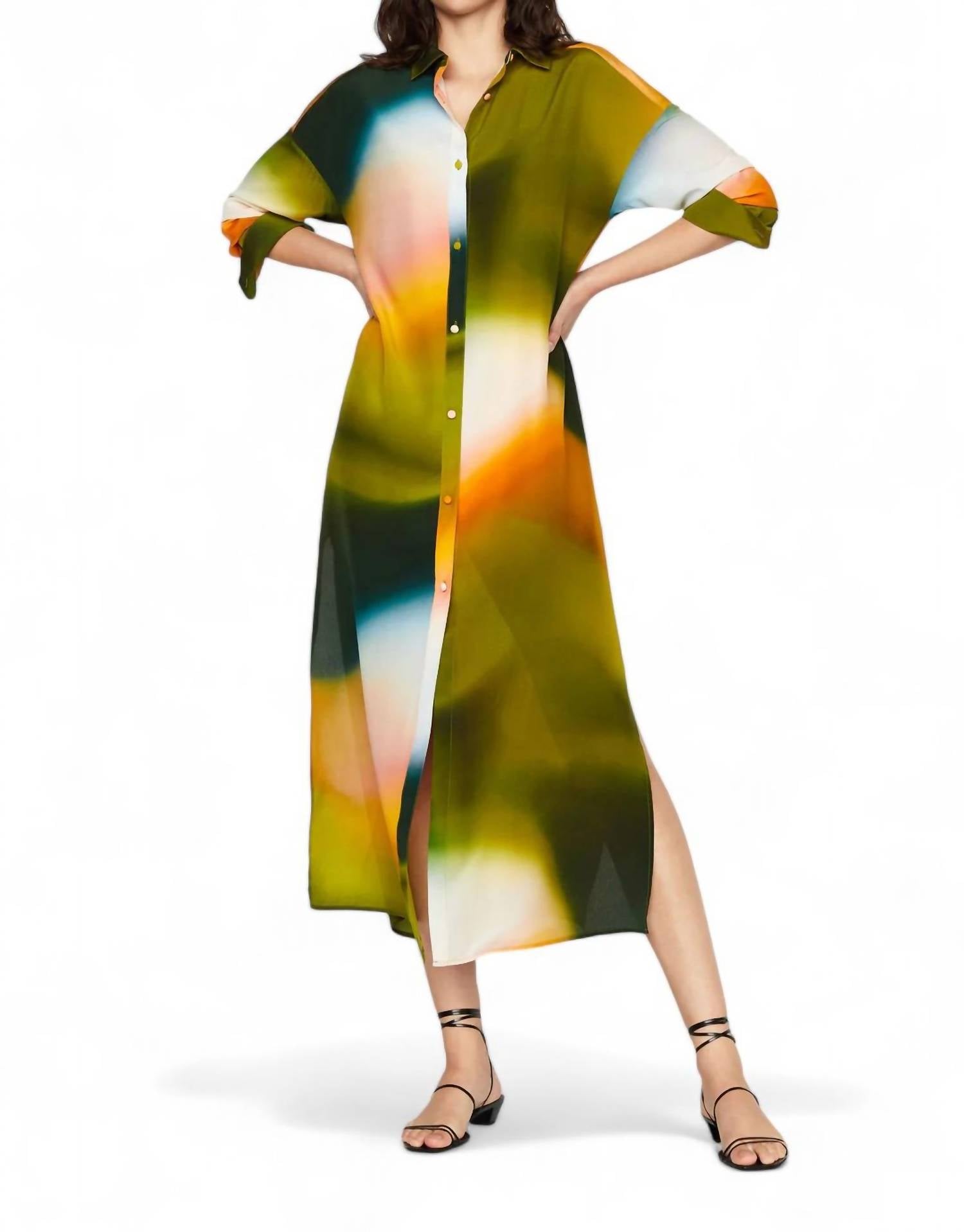 Это платье-рубашка имеет классический воротник и длинные рукава с закрытыми пуговицами и боковыми разрезами для дополнительного стиля. Изготовлено из 100% шелка, без подкладки и соответствует размеру. Для ухода можно сдавать в химчистку или стирать вручную.