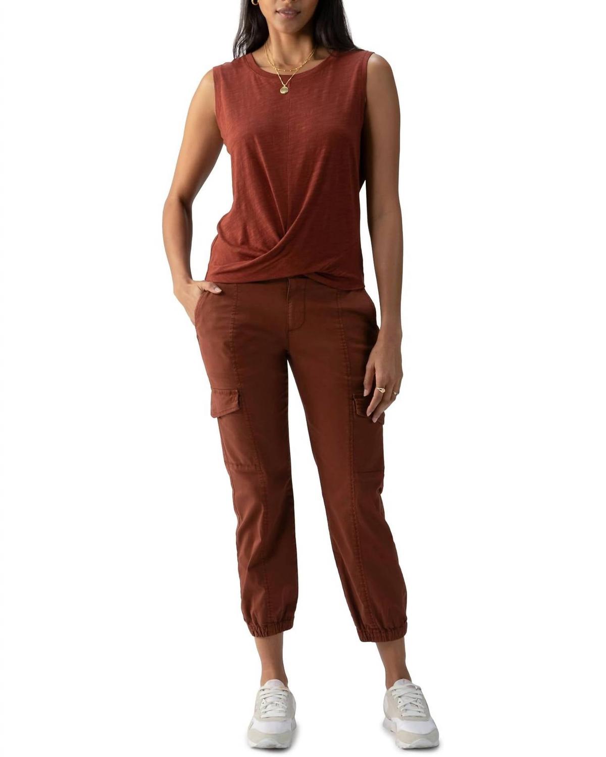 Эти брюки-утилиты имеют высокую посадку, зауженные штанины, эластичные манжеты и множество карманов. Изготовлены из 97% хлопка и 3% спандекса, имеют застежку-молнию, застежку на две пуговицы и внутренний шов 27 дюймов. Ручная стирка и сушка на веревке.