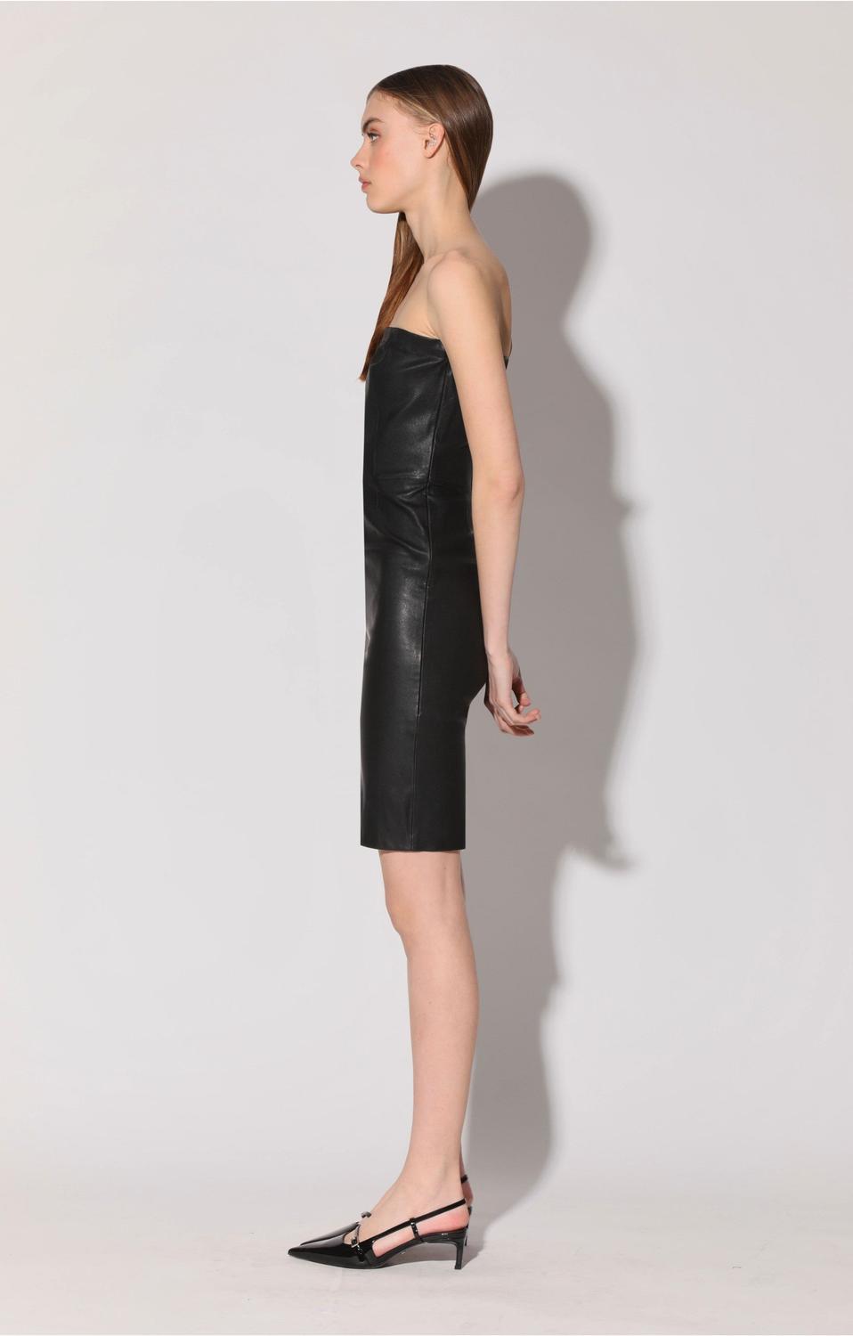 Сексуальность — это просто с нашим платьем Alexis! Этот облегающий фасон без бретелек из нашей великолепной эластичной кожи создан для идеального выхода в свет