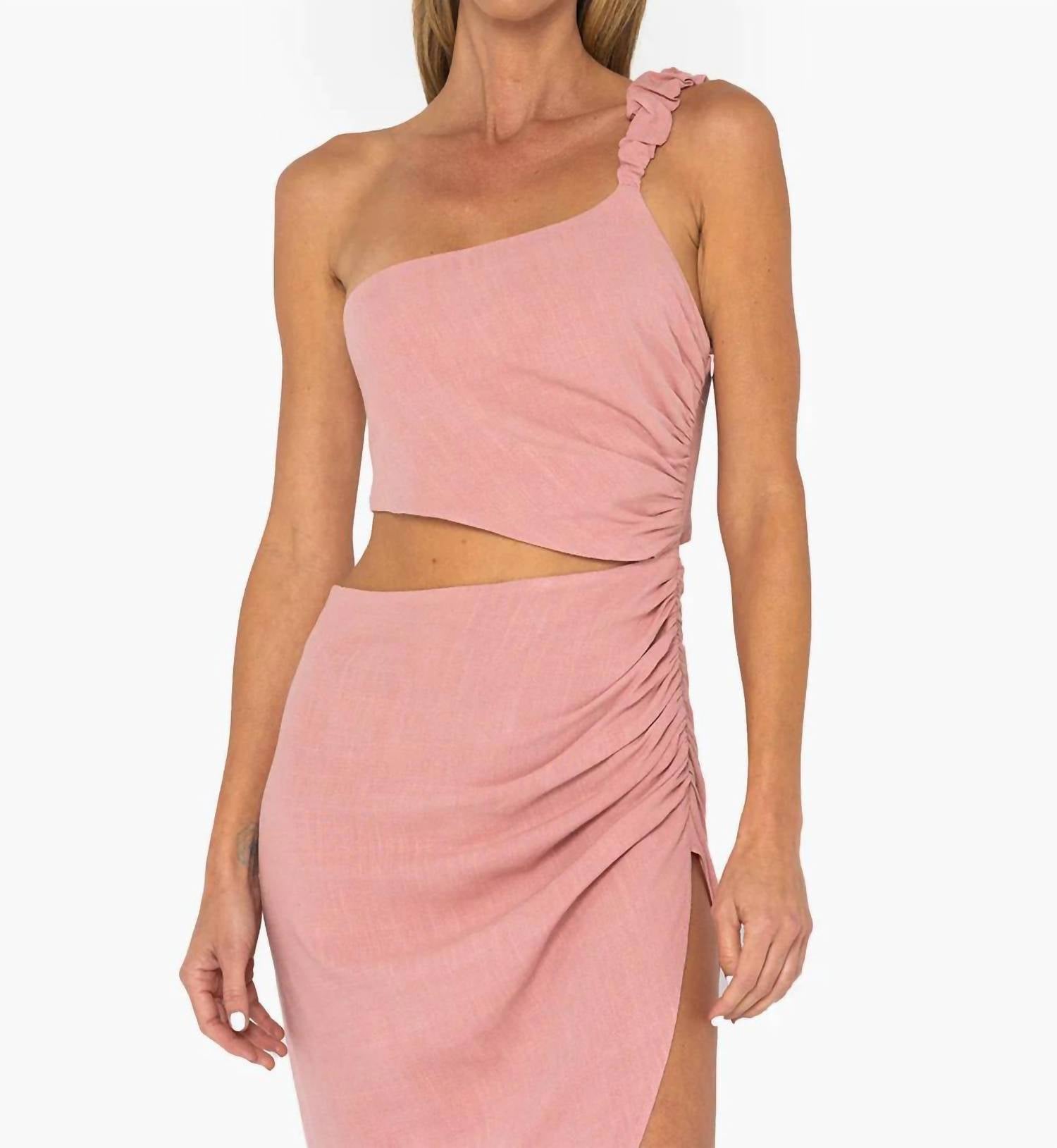 Платье Olive Dress — изысканный силуэт с облегающим кроем и шелковистой текстурой, выполнено из шелковистого вискозного льна. Цельное чудо, подчеркивающее талию вырезом на талии, сборкой с одной стороны в высокий разрез и сборкой на одно плечо. 70% вискозы, 30% льна. Деликатная машинная стирка со светлыми цветами.