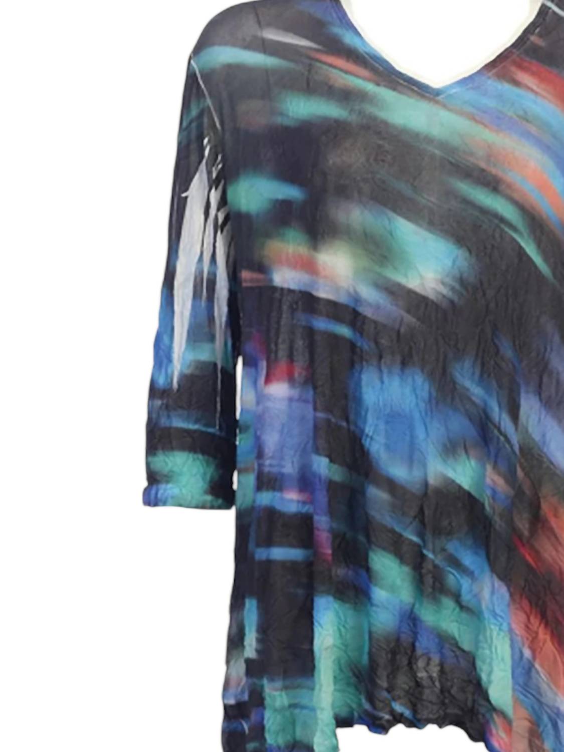 V-образный вырез, рукава 7/8 и подол с акульим укусом. Полупрозрачная легкая ткань с А-образным кроем. Боковые стороны длиннее. 92% полиэстер, 8% спандекс. Холодная стирка, сушка на горизонтальной поверхности в расправленном виде. Сделано в США.