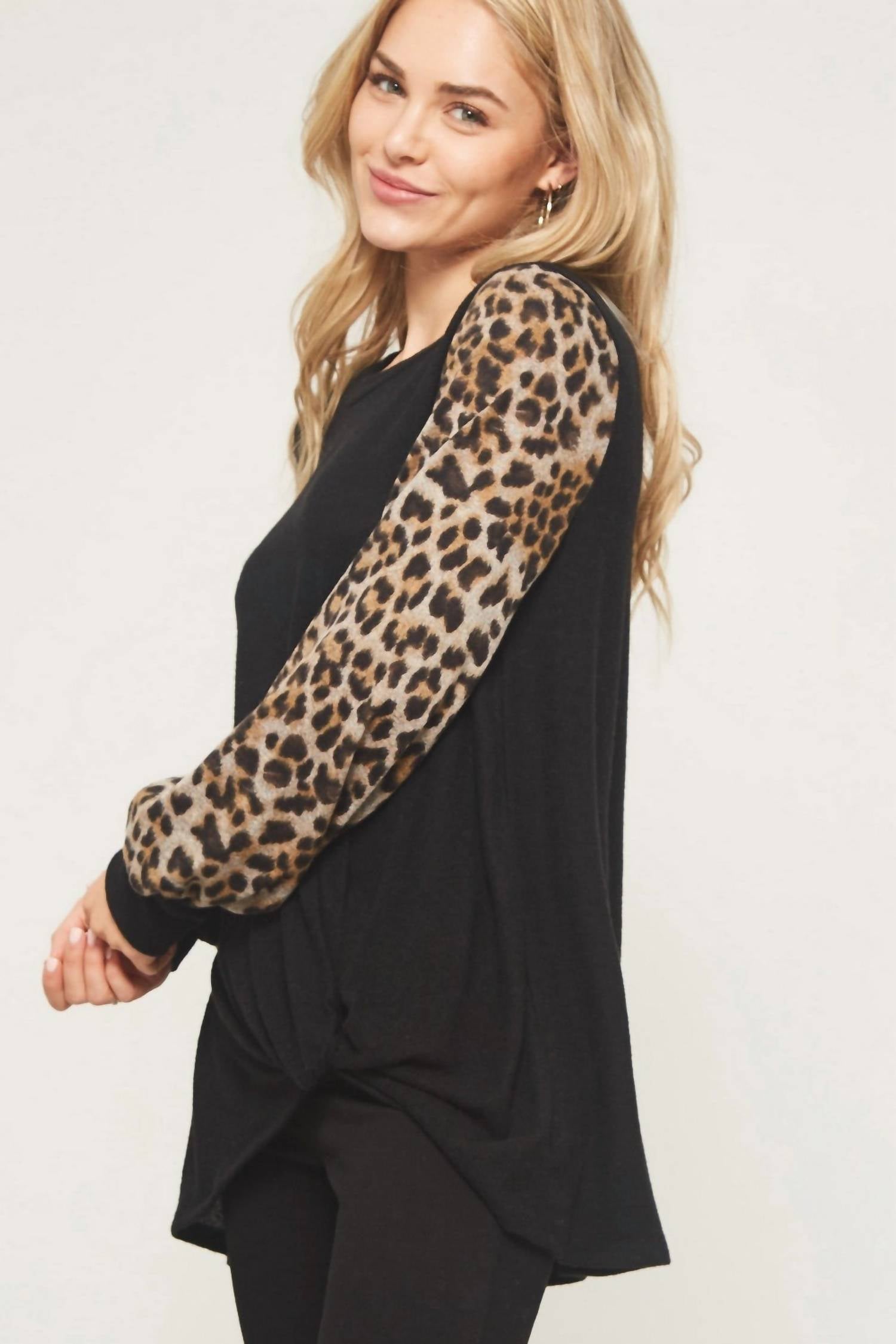 Круглый вырез, контрастный леопардовый принт, длинные рукава-фонарики с ребристыми манжетами и завязанным узлом подолом. Маленькая грудь 36" Длина 26", Средняя грудь 38" Длина 27", Большая грудь 40" Длина 28". 75% вискоза 20% полиэстер 5% спандекс. Сделано в США.