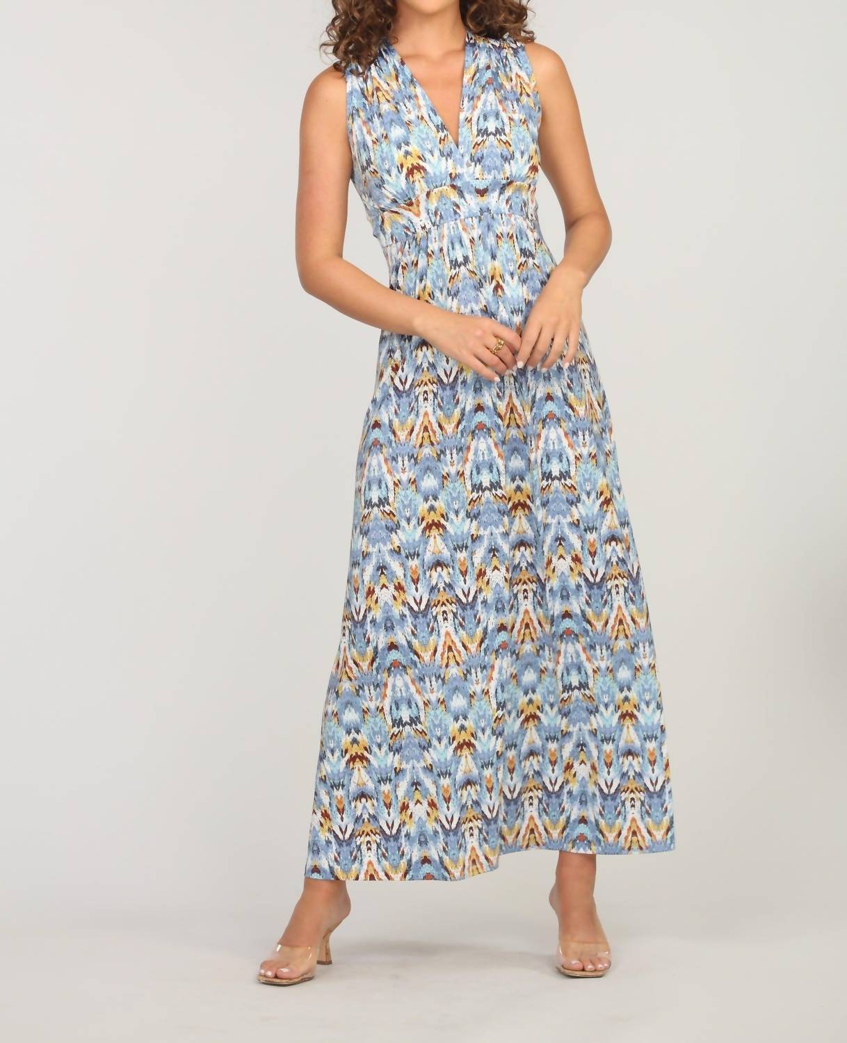 Без рукавов. Макси-платье. V-образный вырез. Завышенная талия. Платье имеет мягкие цвета: синий, ржавый, кремовый и желтый. Легкая эластичная ткань. Машинная стирка в холодной воде. 94% полиэстер; 6% спандекс.