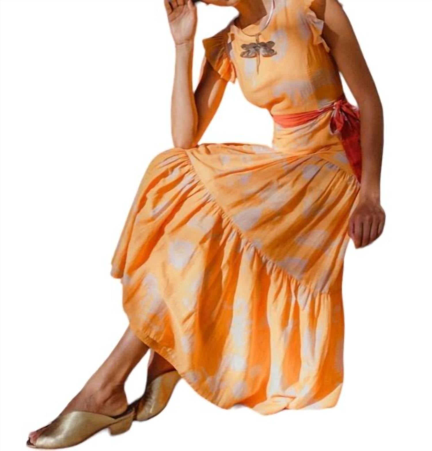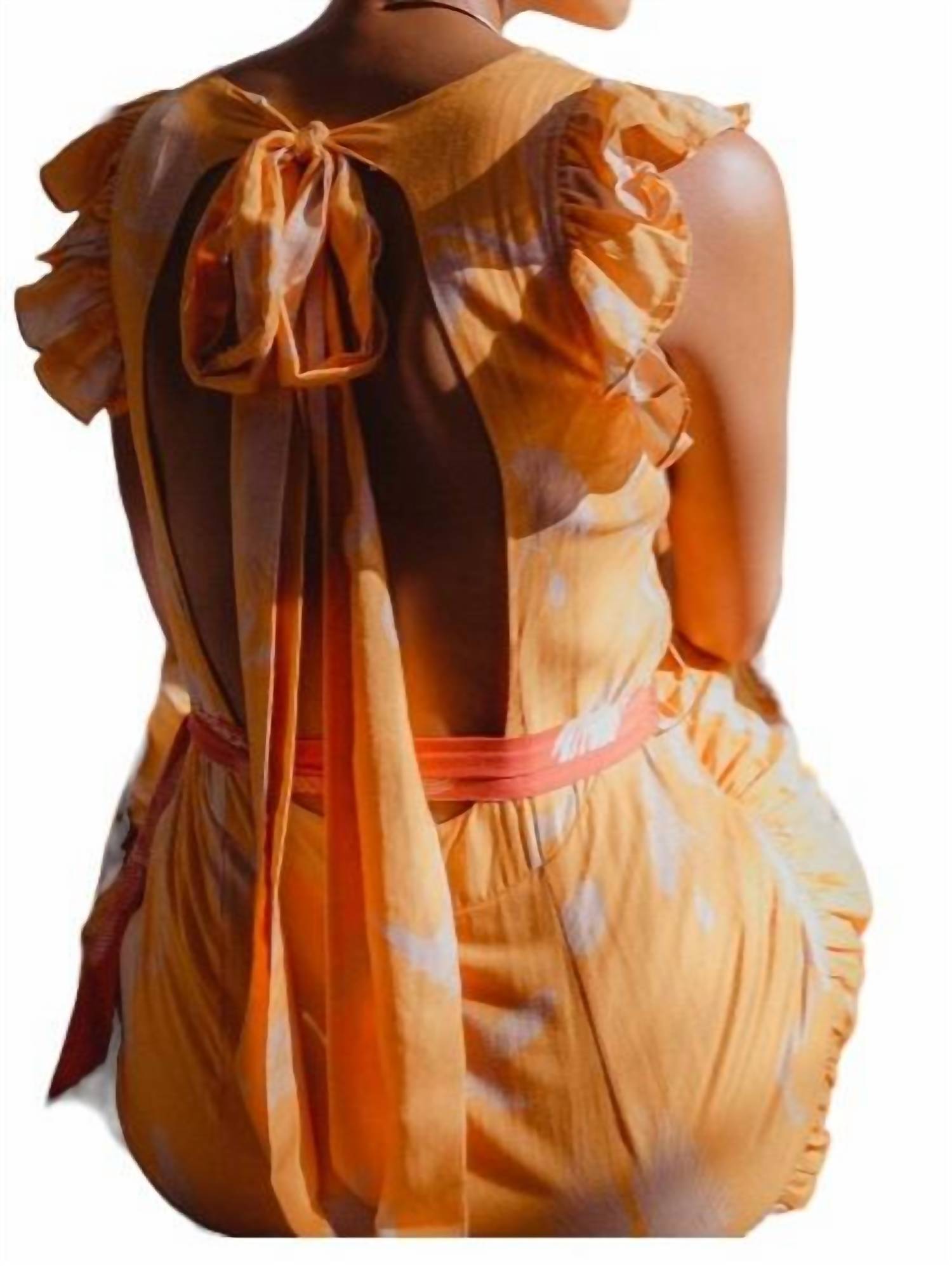 Без рукавов. Платье макси-длины. Цветочный принт по всей поверхности. Рукава-крылышки. Открытая спина с завязывающимся бантом. Фиксированная талия. Съемный пояс. Многоуровневый силуэт. Соответствует размеру. 100% хлопок.