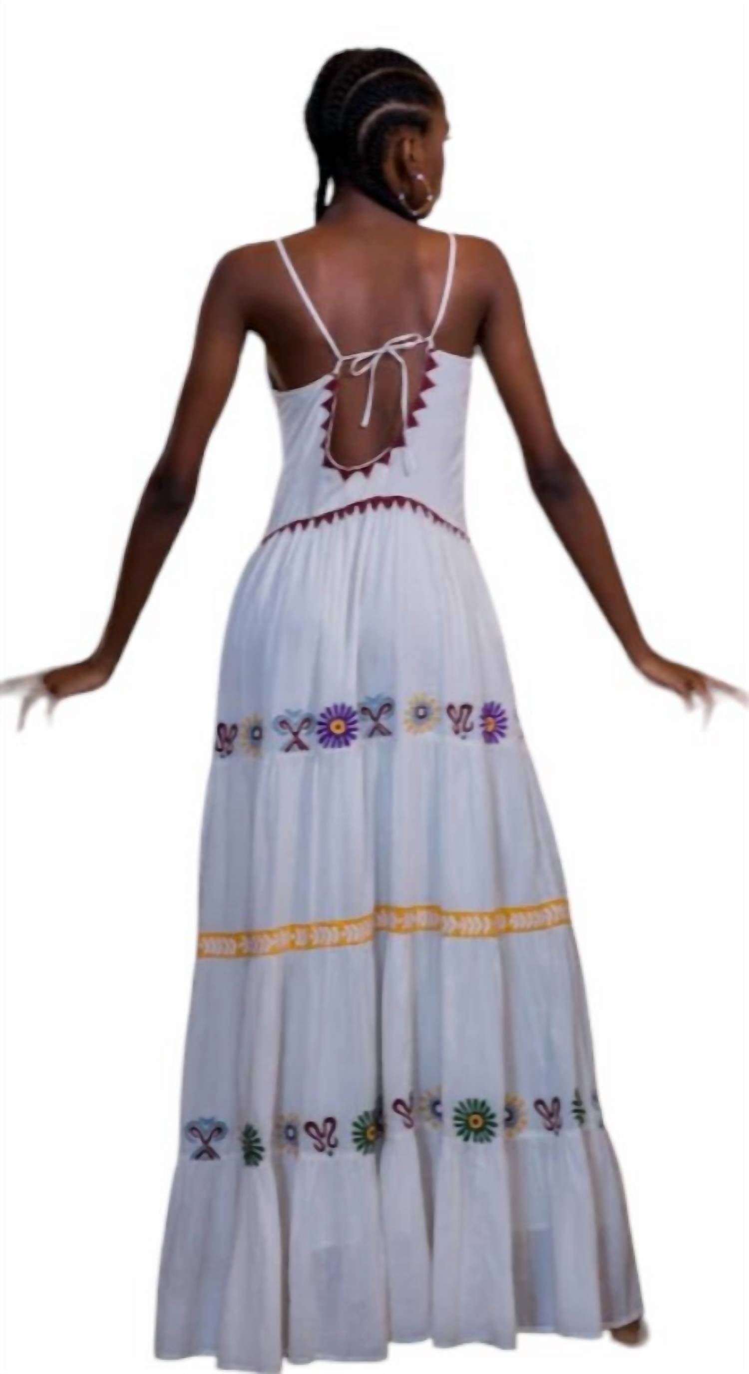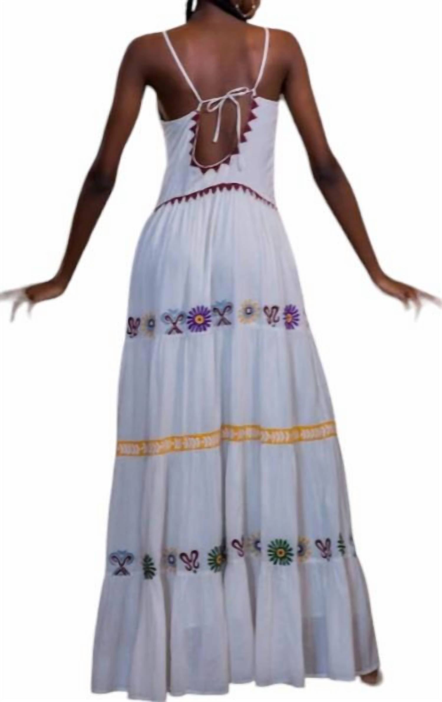 V-образный вырез. Многоуровневая юбка с аппликациями. Длина макси. Свободный крой. На подкладке. Соответствует размеру. 100% органический хлопок.