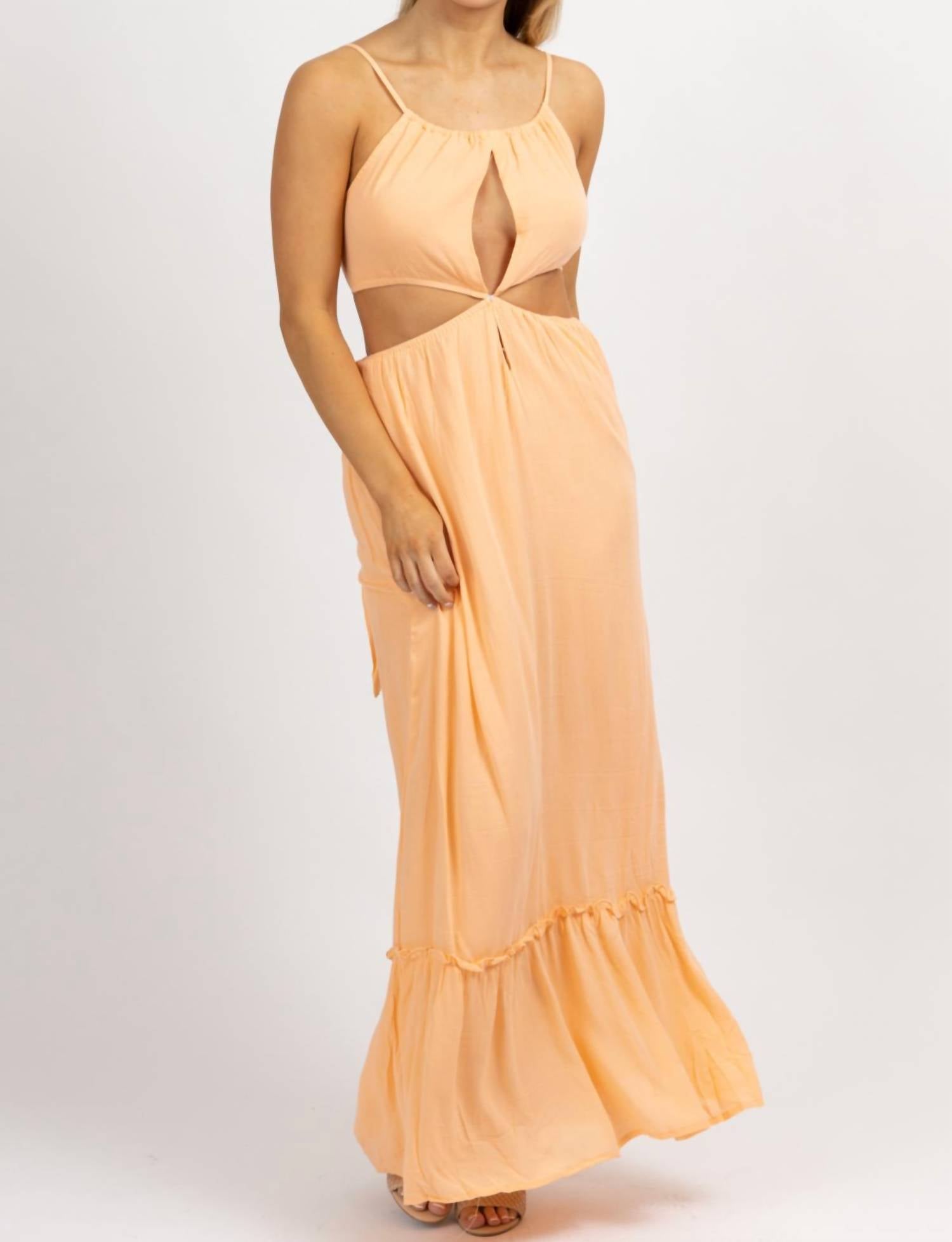 Вырез сбоку, открытая спина, завязка сзади, открытый перед, регулируемые бретели. 100% вискоза. На модели размер small. Рост 5'8, размер платья 2.