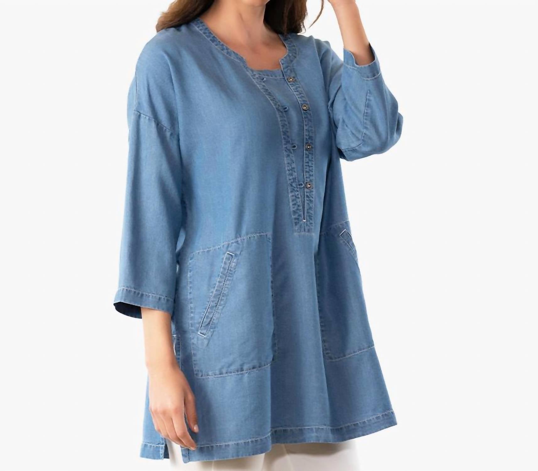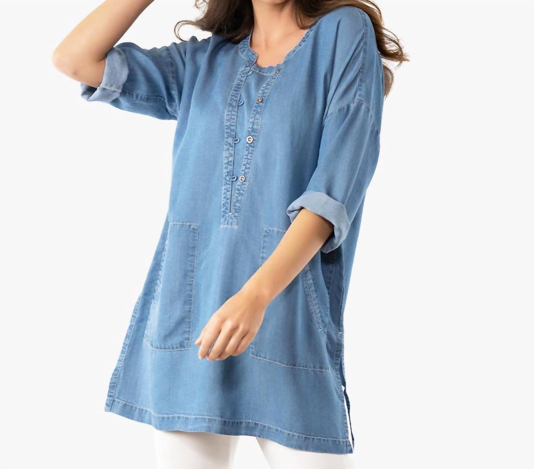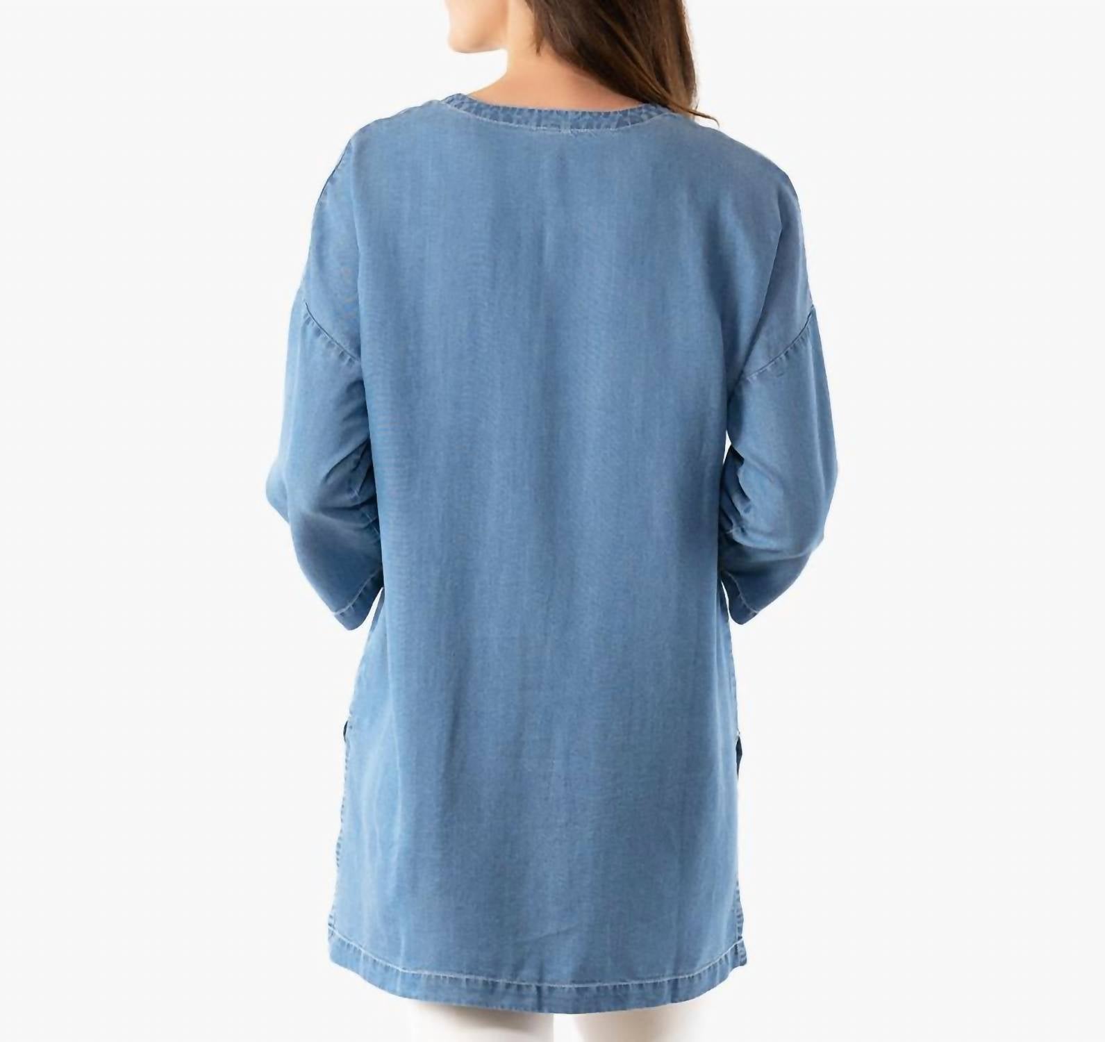 Экологичная туника из супермягкого денима Tencel. Длина по спинке составляет примерно 33 дюйма для размера S. Модель выше ростом 5 футов 11 дюймов в размере S, но эта туника одинаково хорошо смотрится и на невысоких женщинах.